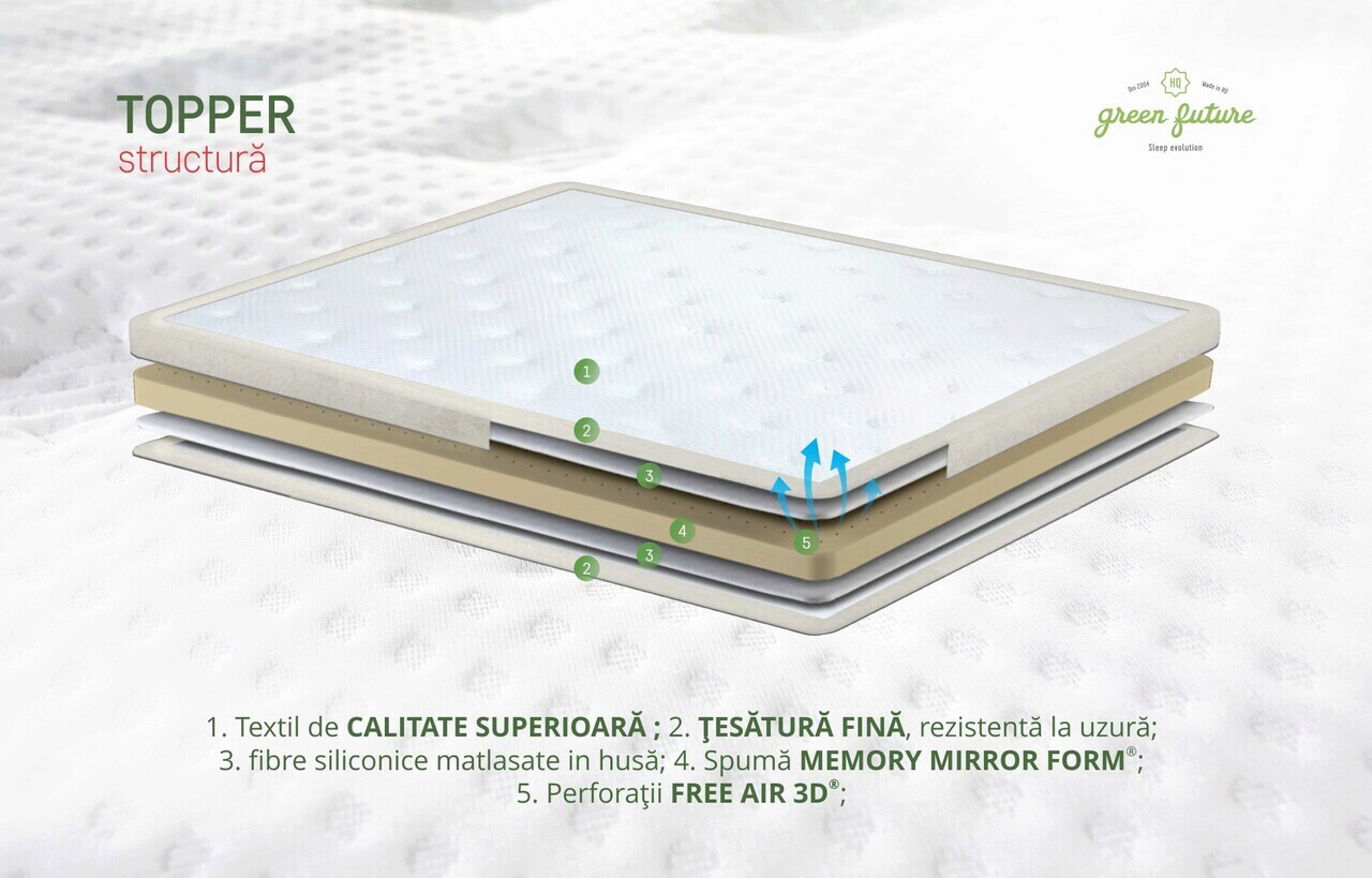 - Topper-ul completează sistemul, adaugand un strat suplimentar de confort și protectie. Conceput pentru a se potrivi perfect peste saltea, imbunatateste calitatea somnului prin stratul suplimentar de spuma Memory Mirror Form®, protejand totodata salteaua si prelungind durabilitatea intregului sistem.