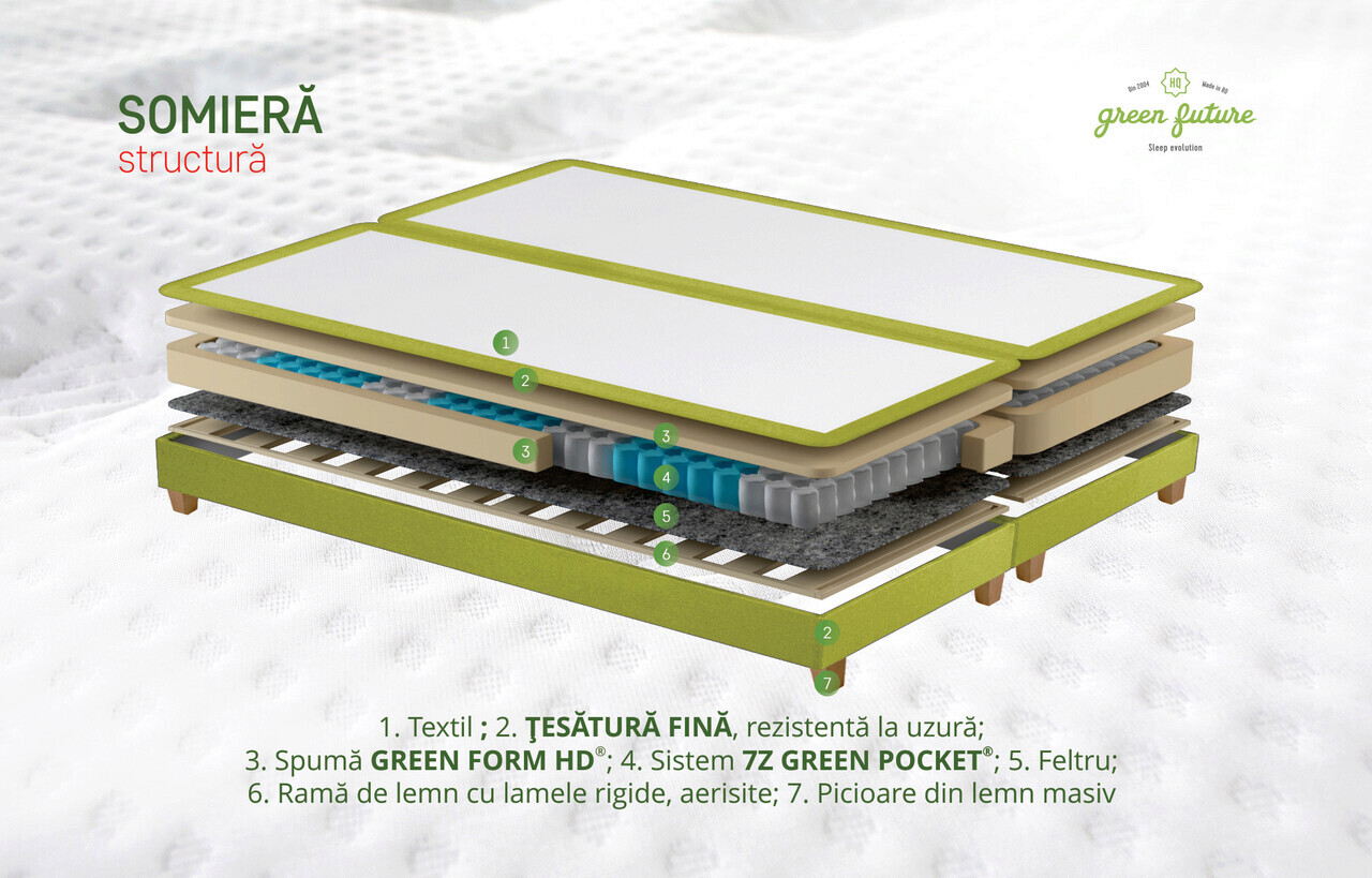 - Baza patului, realizata din lemn de inaltă calitate, serveste drept temelie robusta, creand un cadru stabil și durabil. Prevazuta cu tehnologia avansată a arcurilor 7Z Green Pocket®, aceasta este proiectata meticulos pentru a oferi o stabilitate sporita. Fiecare detaliu este optimizat pentru aerisire si suport, asigurand o baza solida pentru restul componentelor. In plus, structura patului este realizata din doua somiere separate, facilitand atat asamblarea rapida, cat si intretinerea usoara.