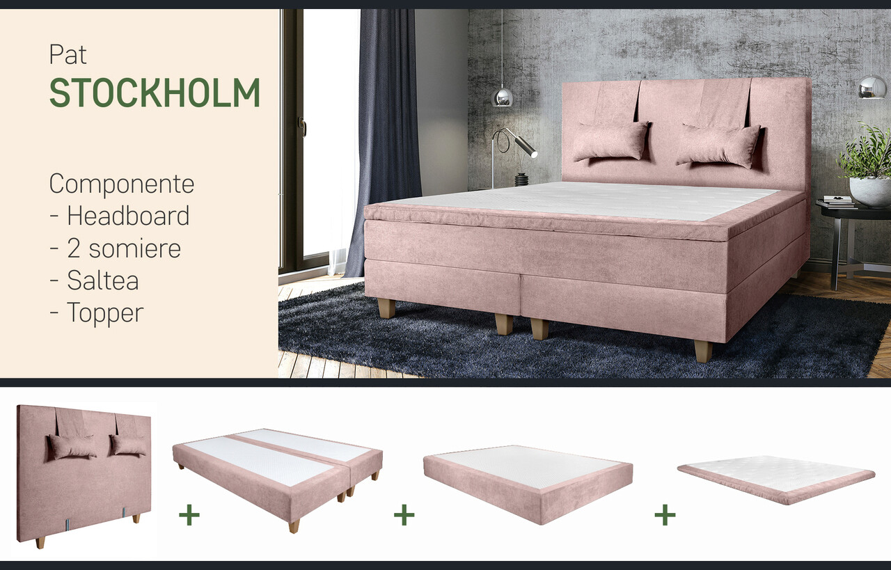 Pat matrimonial, Stockholm, Classic E, 180x200 cm, saltea tip Pocket, topper memory, Roz pudra