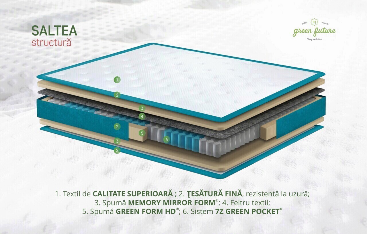 - Salteaua ortopedica, al doilea element al acestui sistem, este proiectata sa functioneze in armonie cu baza patului, adaptandu-se la suportul oferit de aceasta și la contururile corpului. Materialele de inalta calitate si tehnologia avansata de fabricatie asigura confortul și durabilitatea necesare pentru un somn de calitate.