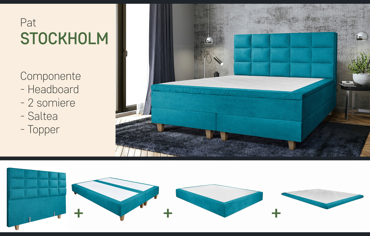 Pat matrimonial, Stockholm, Cubic E, 140x200 cm, saltea tip Pocket, topper memory, Albastru turcoaz