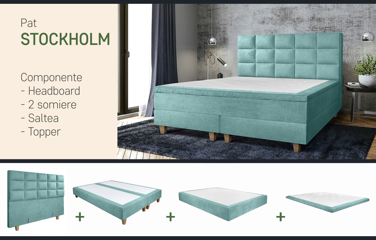 Pat matrimonial, Stockholm, Cubic E, 160x200 cm, saltea tip Pocket, topper memory, Mint
