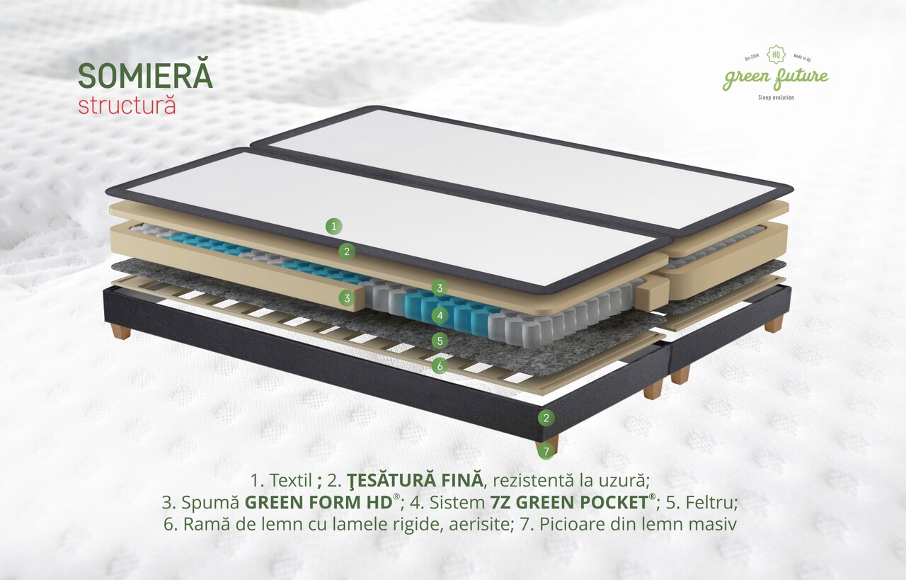 - Baza patului, realizata din lemn de inaltă calitate, serveste drept temelie robusta, creand un cadru stabil și durabil. Prevazuta cu tehnologia avansată a arcurilor 7Z Green Pocket®, aceasta este proiectata meticulos pentru a oferi o stabilitate sporita. Fiecare detaliu este optimizat pentru aerisire si suport, asigurand o baza solida pentru restul componentelor. In plus, structura patului este realizata din doua somiere separate, facilitand atat asamblarea rapida, cat si intretinerea usoara.