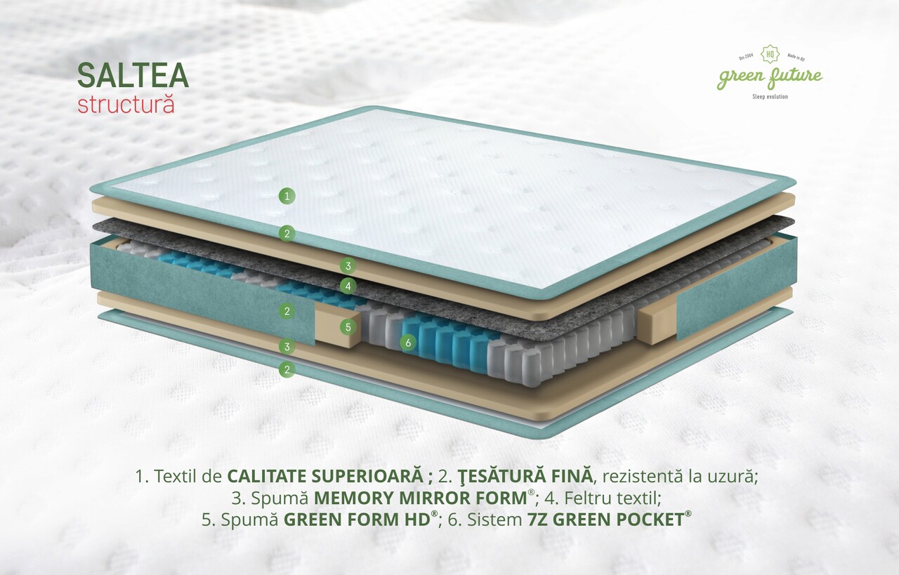 Spuma Memory Mirror Form®, renumita pentru capacitatea sa de a se mula pe forma corpului, distribuie greutatea corporala in mod egal, reducand punctele de presiune (umeri, solduri si picioare) pentru a oferi relaxarea totala a muschilor in timpul somnului.