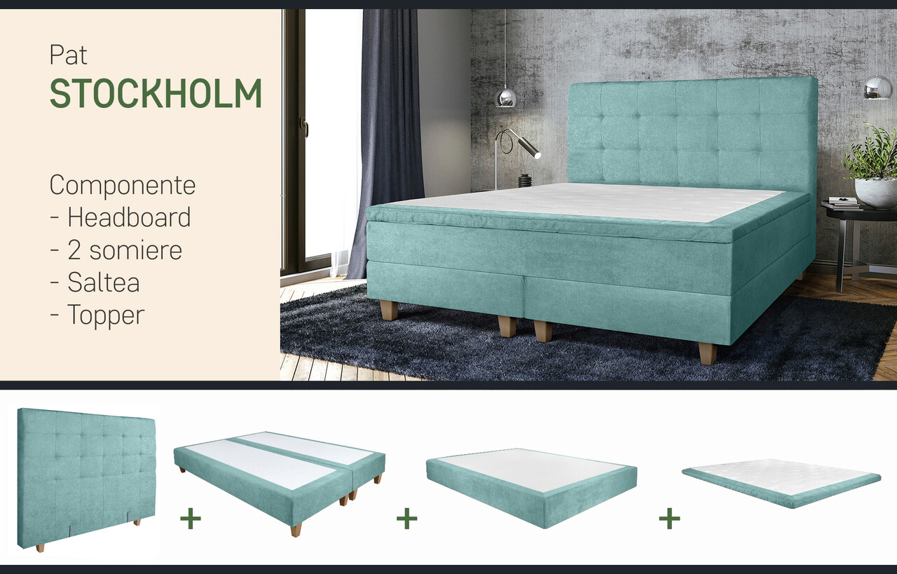 Pat matrimonial, Stockholm, Dots E, 140x200 cm, saltea tip Pocket, topper memory, Mint
