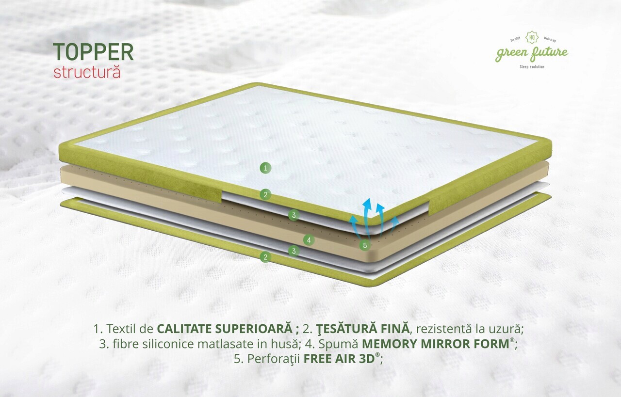 - Topper-ul completează sistemul, adaugand un strat suplimentar de confort și protectie. Conceput pentru a se potrivi perfect peste saltea, imbunatateste calitatea somnului prin stratul suplimentar de spuma Memory Mirror Form®, protejand totodata salteaua si prelungind durabilitatea intregului sistem.