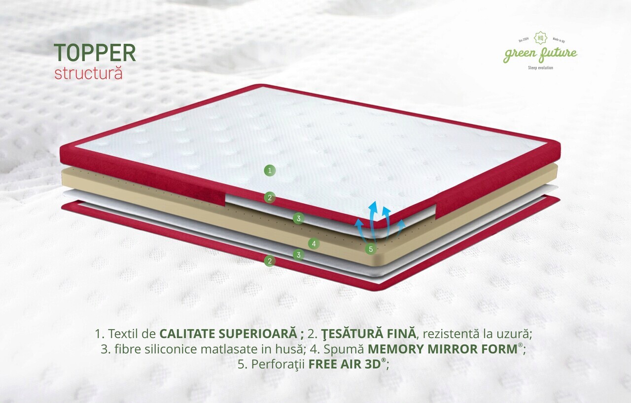 - Topper-ul completează sistemul, adaugand un strat suplimentar de confort și protectie. Conceput pentru a se potrivi perfect peste saltea, imbunatateste calitatea somnului prin stratul suplimentar de spuma Memory Mirror Form®, protejand totodata salteaua si prelungind durabilitatea intregului sistem.