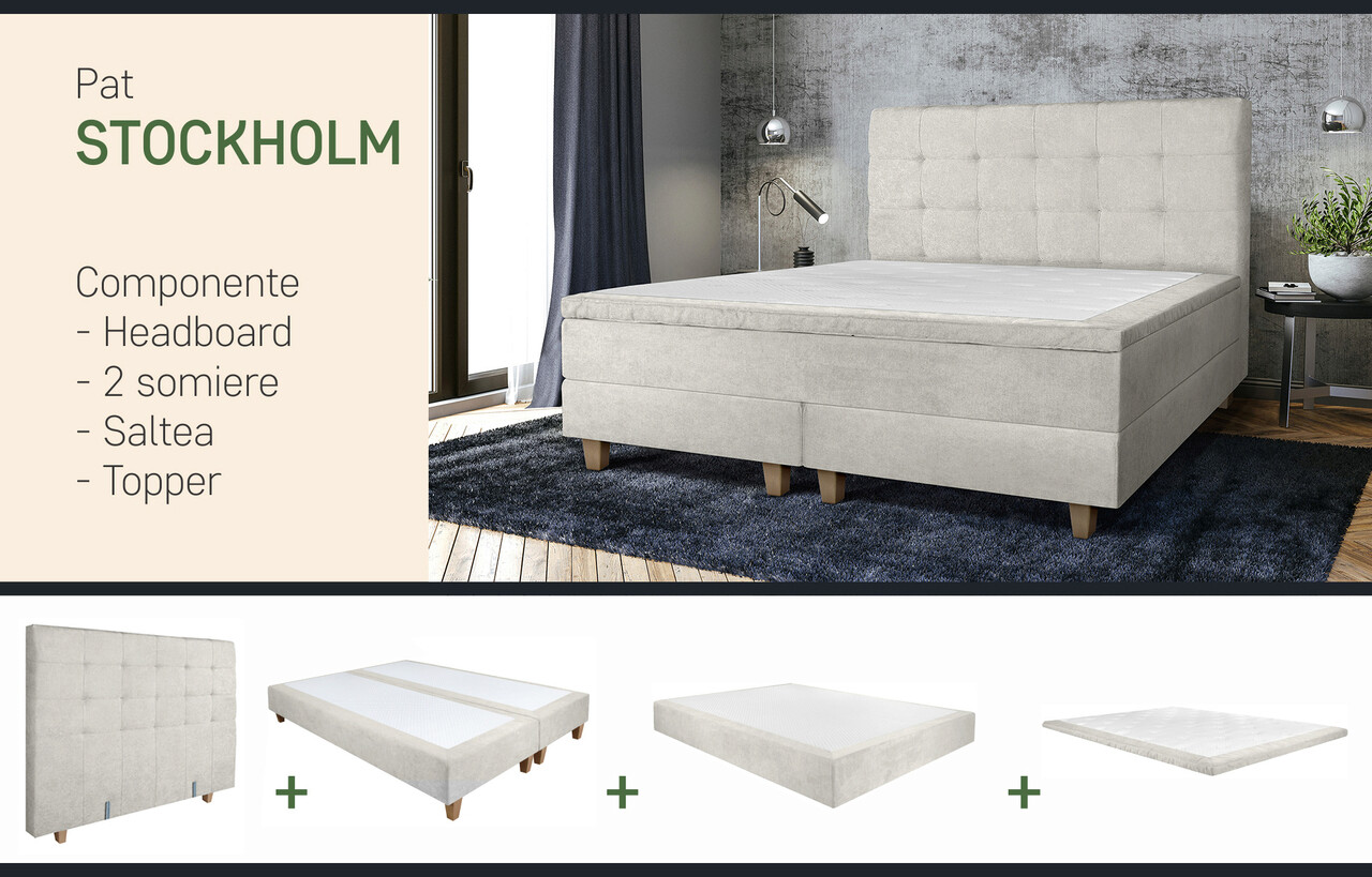 Pat matrimonial, Stockholm, Dots E, 180x200 cm, saltea tip Pocket, topper memory, Bej