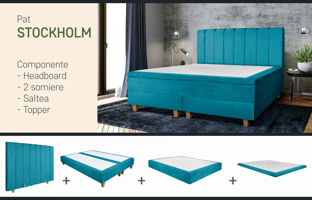 Pat matrimonial, Stockholm, Lines E, 140x200 cm, saltea tip Pocket, topper memory, Turcoaz