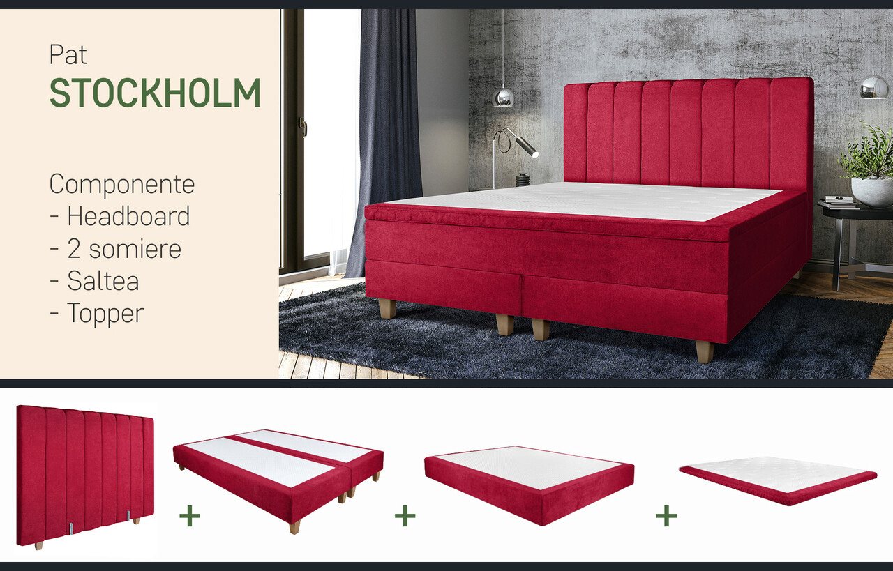 Pat matrimonial, Stockholm, Lines E, 180x200 cm, saltea tip Pocket, topper memory, Rosu