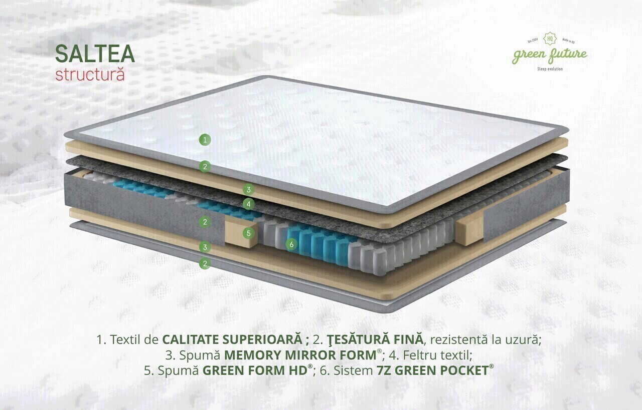 - Salteaua ortopedica, al doilea element al acestui sistem, este proiectata sa functioneze in armonie cu baza patului, adaptandu-se la suportul oferit de aceasta și la contururile corpului. Materialele de inalta calitate si tehnologia avansata de fabricatie asigura confortul și durabilitatea necesare pentru un somn de calitate.