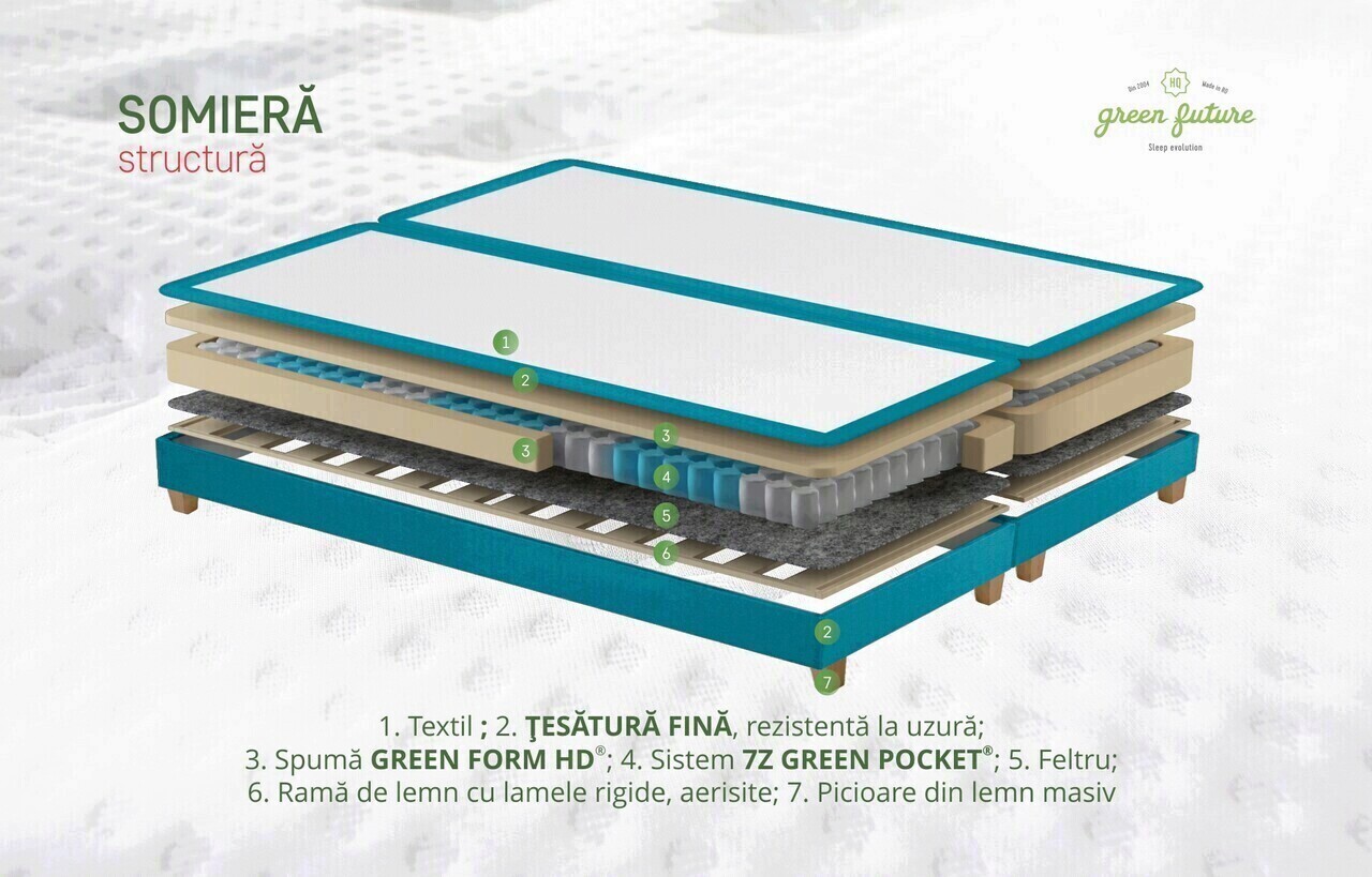 - Baza patului, realizata din lemn de inaltă calitate, serveste drept temelie robusta, creand un cadru stabil și durabil. Prevazuta cu tehnologia avansată a arcurilor 7Z Green Pocket®, aceasta este proiectata meticulos pentru a oferi o stabilitate sporita. Fiecare detaliu este optimizat pentru aerisire si suport, asigurand o baza solida pentru restul componentelor. In plus, structura patului este realizata din doua somiere separate, facilitand atat asamblarea rapida, cat si intretinerea usoara.