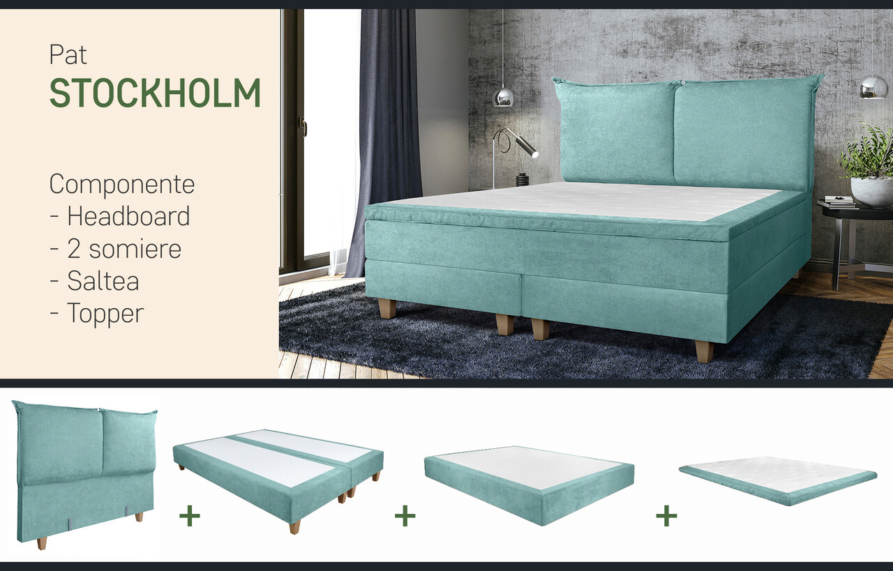 Pat matrimonial, Stockholm, Pillows E, 160x200 cm, saltea tip Pocket, topper memory, Mint