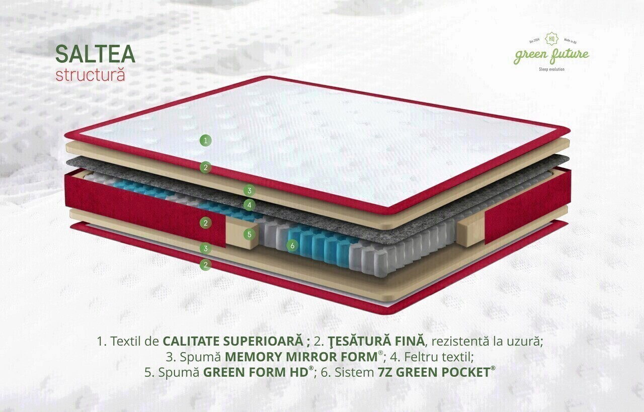 Spuma Memory Mirror Form®, renumita pentru capacitatea sa de a se mula pe forma corpului, distribuie greutatea corporala in mod egal, reducand punctele de presiune (umeri, solduri si picioare) pentru a oferi relaxarea totala a muschilor in timpul somnului.