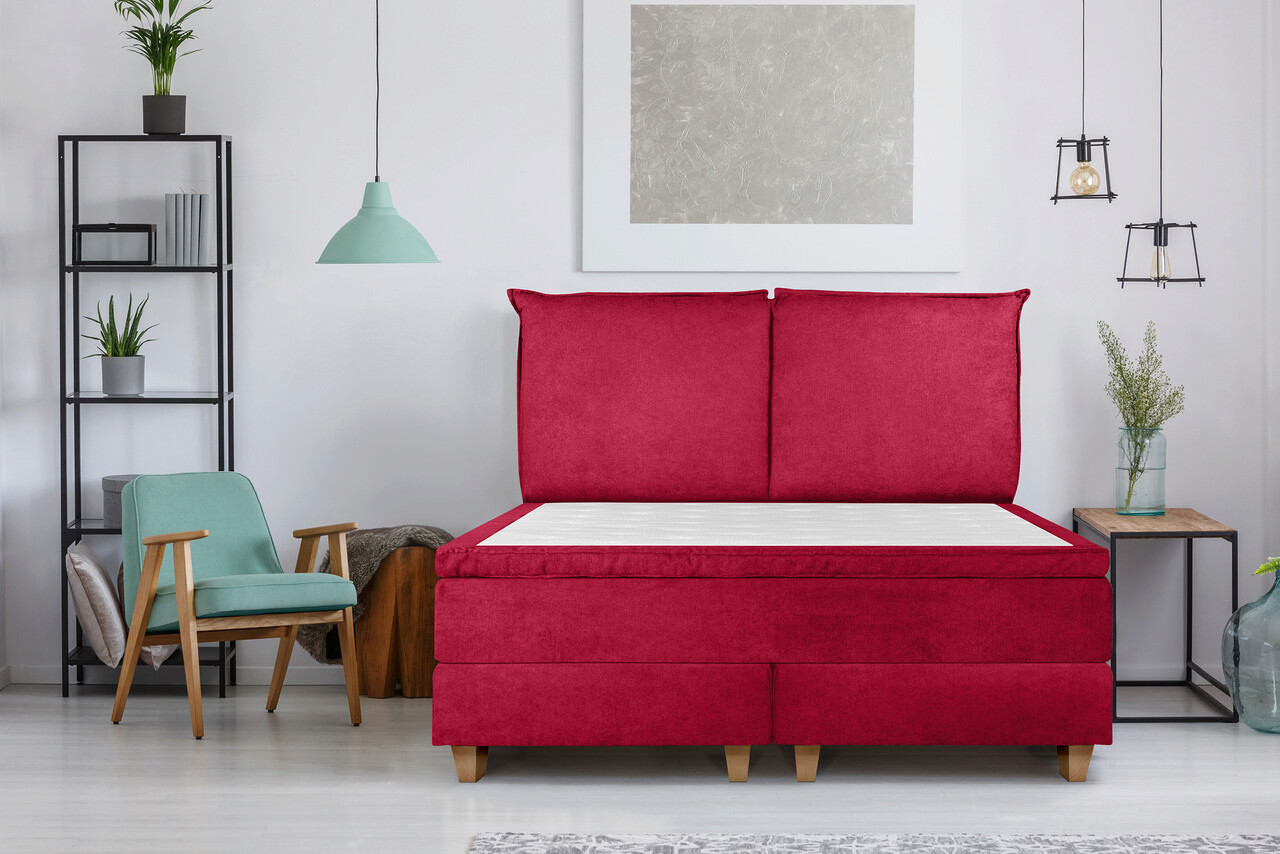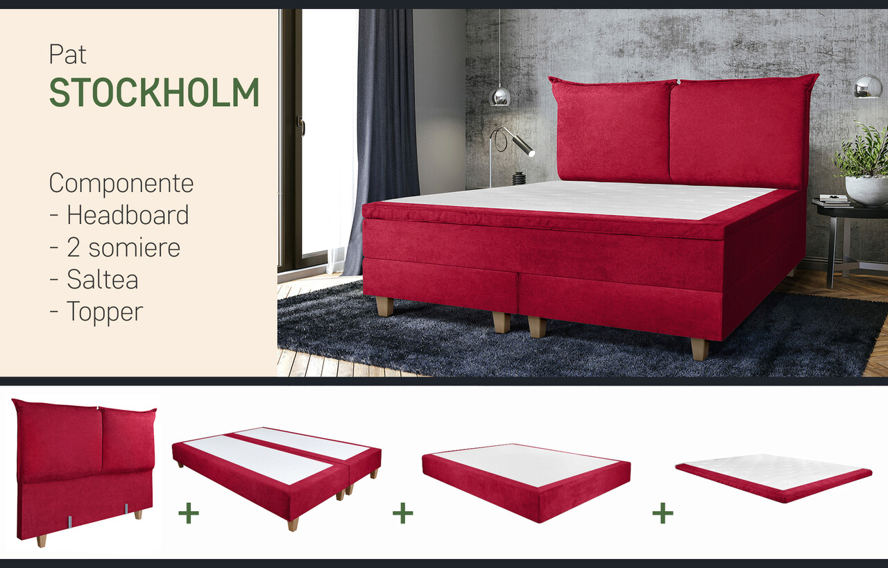 Pat matrimonial, Stockholm, Pillows E, 180x200 cm, saltea tip Pocket, topper memory, Rosu