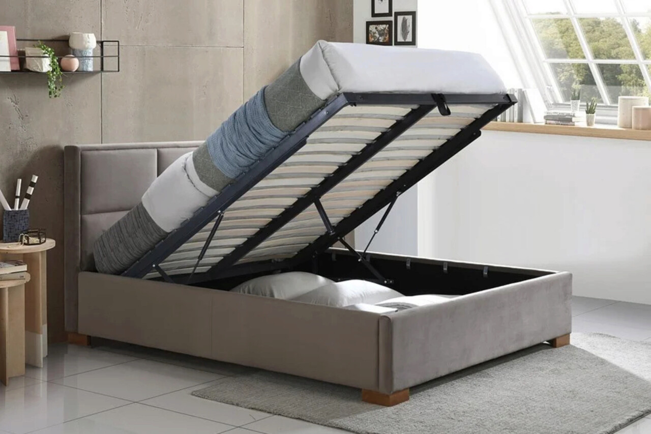 Pat matrimonial tapitat, cu tablie si lada depozitare Maison Velvet, Signal, 160x200 cm, catifea, bej