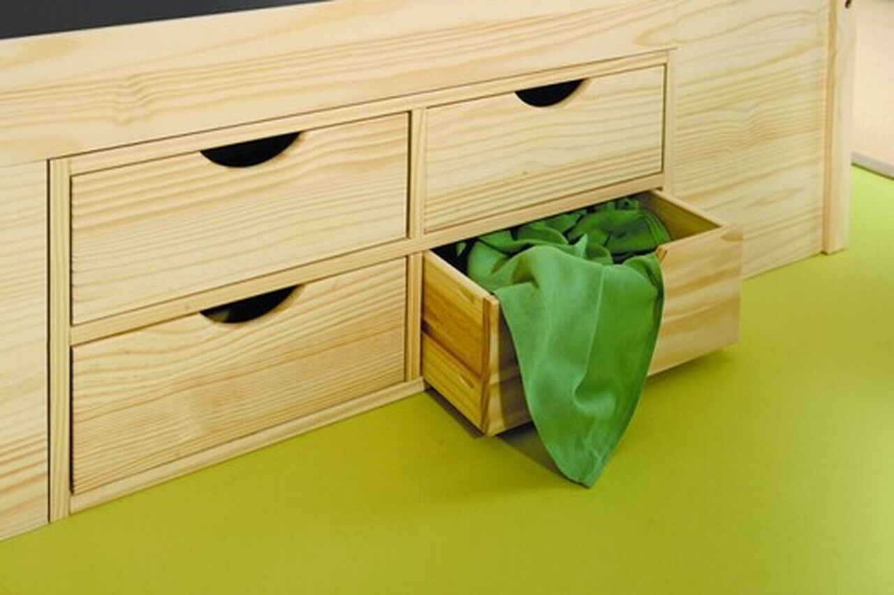 Acest pat functional este fabricat din lemn masiv de pin (pin parfumat) si finisat cu un lac transparent. Fibra ramane vizibila, evidentiind caracterul natural al lemnului. Lemnul de plantatie sustenabil, ecologic si organic ofera caldura, confort si o atmosfera primitoare. Experimentati senzatia pura a lemnului natural autentic.