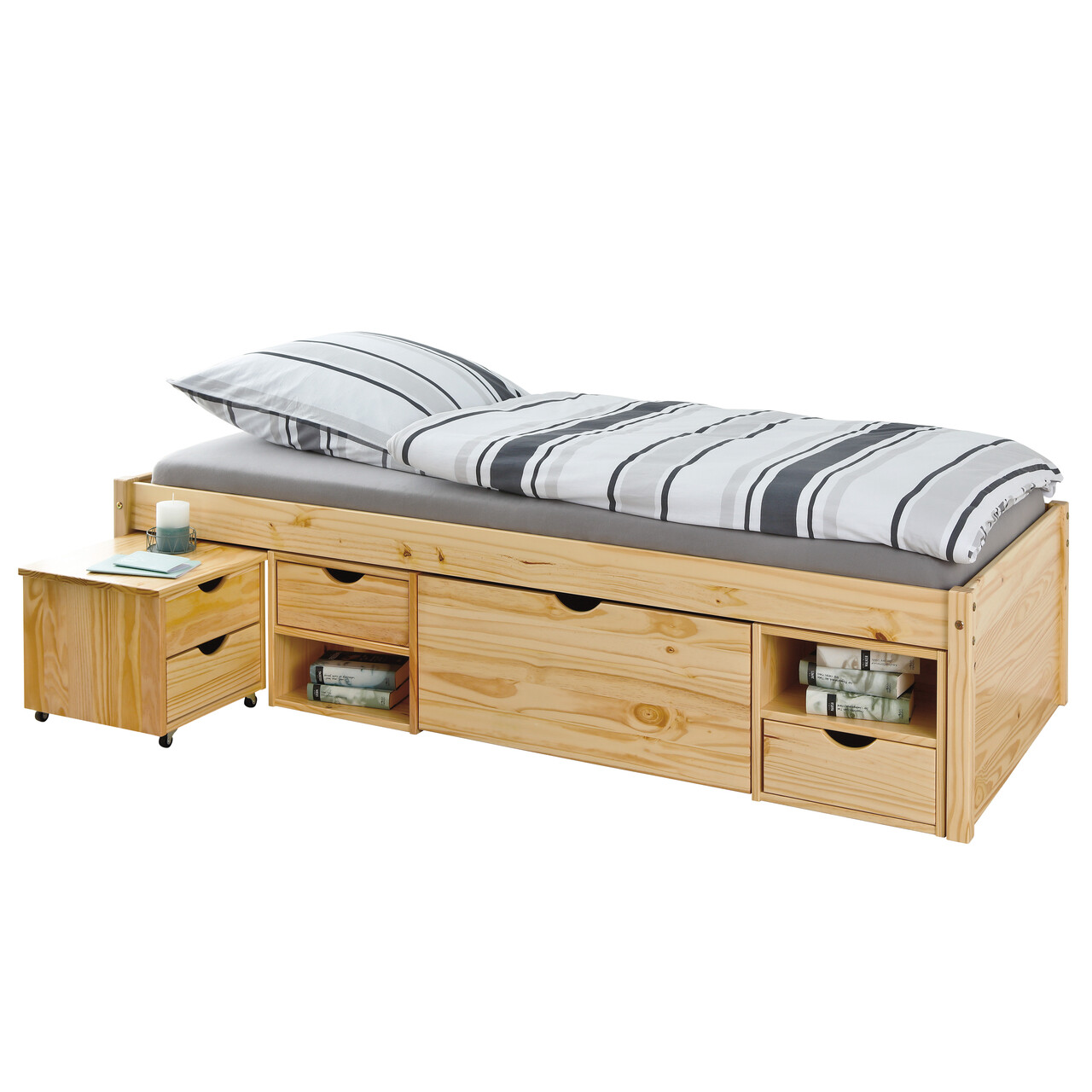 Patul functional Claas este ideal pentru camere mai mici, cum ar fi o camera de oaspeti. Este deosebit de practic. Sertarele au dimensiuni standard si pot fi aranjate pentru a se potrivi nevoilor dumneavoastra. Pentru a preveni acumularea de praf dedesubt, patul este complet inchis. Dispune de doua sertare, un sertar mare de depozitare, patru rafturi si o noptiera. Paturi, perne si alte articole pot fi depozitate direct in pat. Finisajul lacuit transparent (natural) evidentiaza caracterul cald si natural al lemnului. Lacul cu emisii reduse este hidrofug si usor de curatat. Lemnul masiv utilizat indeplineste cele mai recente standarde europene de calitate. Numai prin utilizarea unor materiale atent selectionate se poate crea un pat robust si stabil. Pe langa economisirea spatiului, patul functional Claas este si foarte durabil. Somiera cu lamele este inclusa.
