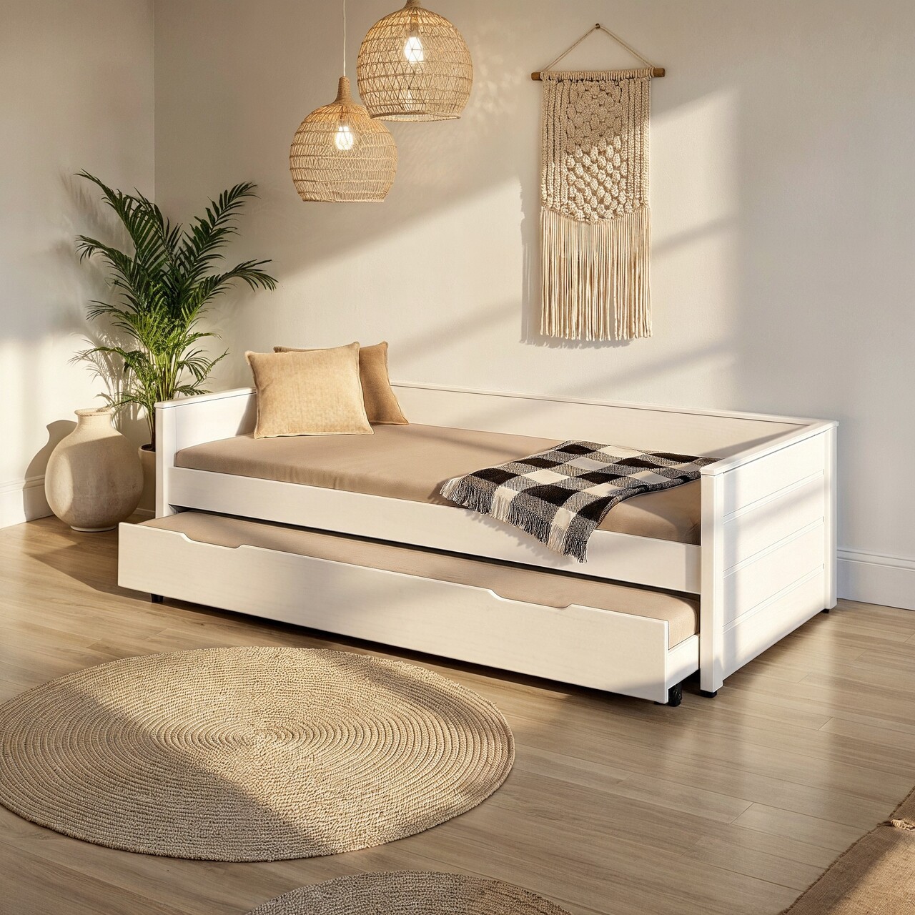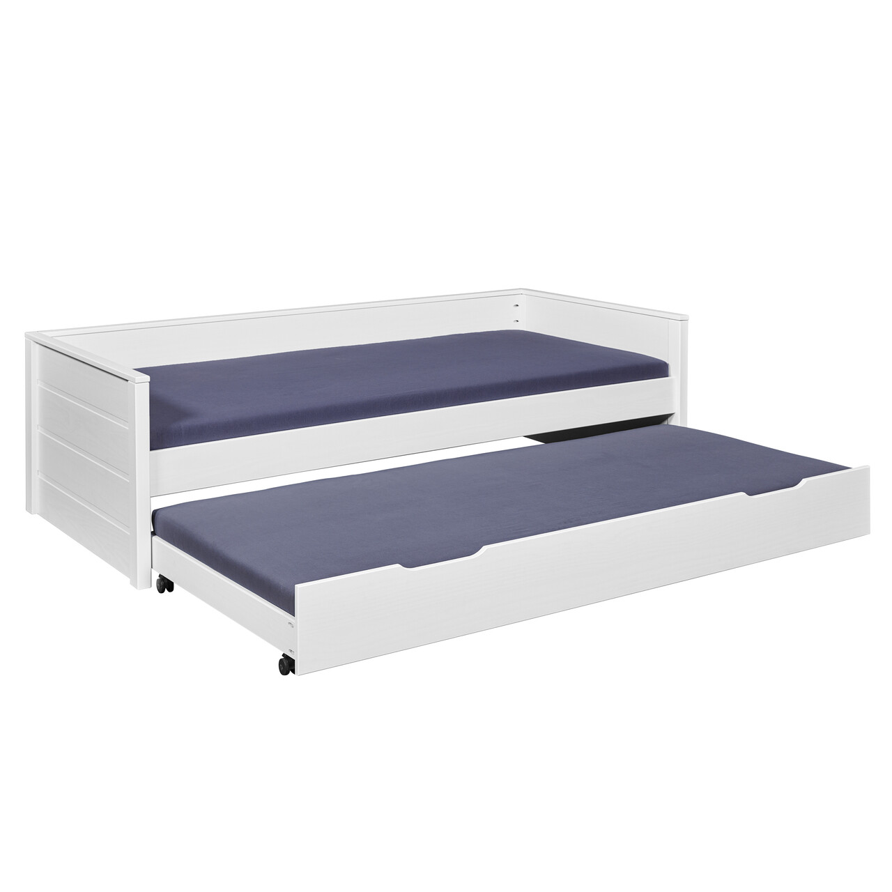 Dream the Future este o canapea extensibila care se distinge prin designul si functionalitatea sa moderna. Acest pat 2 in 1 pentru copii are un sertar extensibil cu baza din MDF. Sertarul poate fi folosit fie ca saltea (max. 12 cm inaltime), fie ca sertar practic pentru depozitarea lenjeriei de pat. Patul este fabricat din lemn masiv de pin cu finisaj lac alb. Fibra caracteristica a pinului este vizibila prin lac, sporind farmecul natural al patului. Materialele utilizate indeplinesc cele mai recente standarde europene de calitate, iar lacul este usor de curatat si hidrofug. Dream the Future: Pentru vise dulci astazi si in viitor. Somiera cu lamele inclusa.