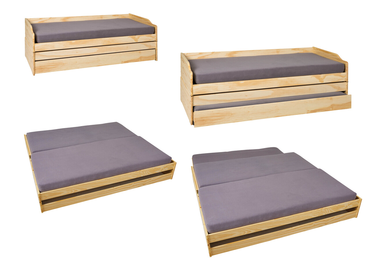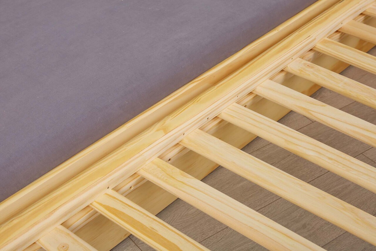 Acest pat functional este fabricat din lemn masiv de pin (pin parfumat) si finisat cu un lac transparent. Fibra ramane vizibila, evidentiind caracterul natural al lemnului. Lemnul de plantatie sustenabil, ecologic si organic ofera caldura, confort si o atmosfera primitoare. Experimentati senzatia pura a lemnului natural, autentic.