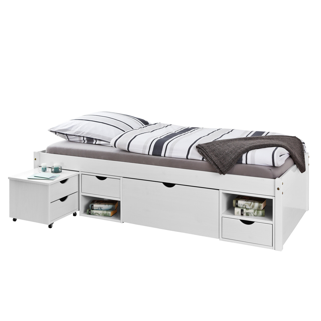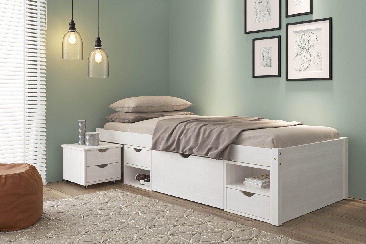 Acest pat functional este ideal pentru camere mai mici, cum ar fi o camera de oaspeti. Till este un pat functional extrem de practic din lemn masiv. Spatiul de dedesubt este utilizat eficient de un sistem de sertare. Patul dispune de doua sertare, un sertar mare de depozitare, patru rafturi si o noptiera. Lenjerii de pat, paturi si alte articole pot fi depozitate direct dedesubt. Lemnul masiv de pin al patului functional Till este vopsit in alb. Pe langa faptul ca ii imbunatateste aspectul, lacul cu emisii reduse protejeaza lemnul, este hidrofug si usor de curatat. Fibra naturala a lemnului este vizibila si evidentiata subtil. Materialul utilizat (lemn masiv) indeplineste cele mai recente standarde europene de calitate. Numai prin utilizarea unor materiale atent selectionate se poate crea un pat robust si stabil. Pe langa economisirea spatiului, patul functional Till impresioneaza si prin durabilitatea sa ridicata. Somiera cu lamele este inclusa.