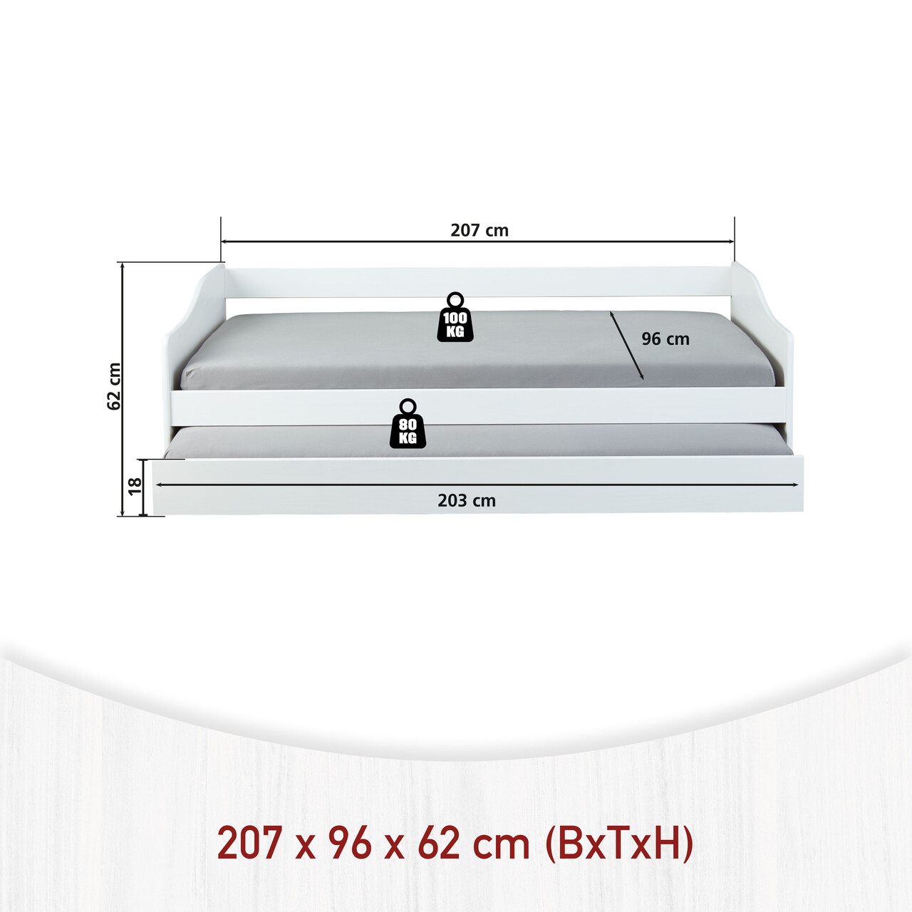 Patul extensibil LEONIE MODEL 23 90x200 cm este perfect pentru camera unui copil sau pentru camera de oaspeti. Datorita designului cu sertare pe roti, puteti utiliza optim spatiul. Acest pat pentru copii, lacuit in alb, ofera doua locuri de dormit de 90x200 cm intr-un singur pat. Practicitatea sa se armonizeaza perfect cu designul simplu, fiind potrivit pentru orice stil de decor. Lemnul masiv de pin al canapelei extensibile LEONIE MODEL 23 este finisat cu un lac alb. Pe langa faptul ca ii imbunatateste aspectul, lacul protejeaza lemnul, este hidrofug si usor de curatat. Fibra naturala a lemnului se vede subtil prin vopseaua alba, evidentiind in mod unic lemnul de pin. Lemnul masiv de pin utilizat in productia canapelei LEONIE MODEL 23 indeplineste cele mai recente standarde europene de calitate. Acest pat robust si functional impresioneaza prin durabilitatea sa ridicata si constructia solida. Sunt incluse somiere cu lamele.