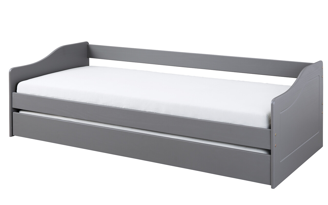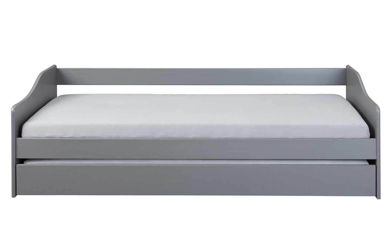 Acest pat functional este fabricat din lemn masiv de pin (pin parfumat) si finisat cu un lac gri. Fibrele sunt inca vizibile, evidentiind caracterul natural al lemnului. Lemnul de plantatie sustenabil, ecologic si organic ofera caldura, confort si o atmosfera primitoare. Experimentati senzatia pura a lemnului natural autentic.