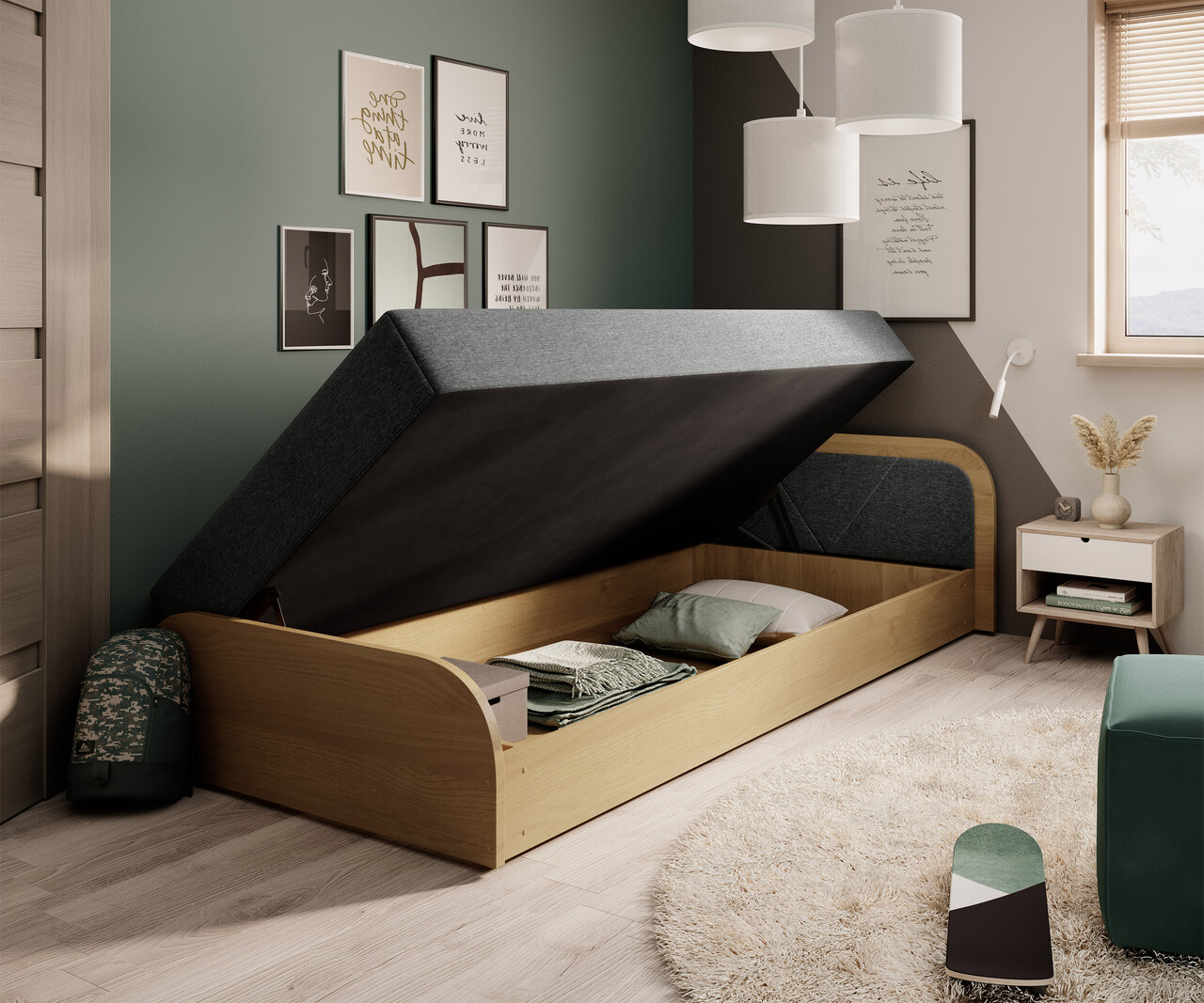 Pat pentru camera copilului, deschidere dreapta, 80x190 cm, ELTAP, PS-01, Parys, lemn/poliester, natur/albastru deschis