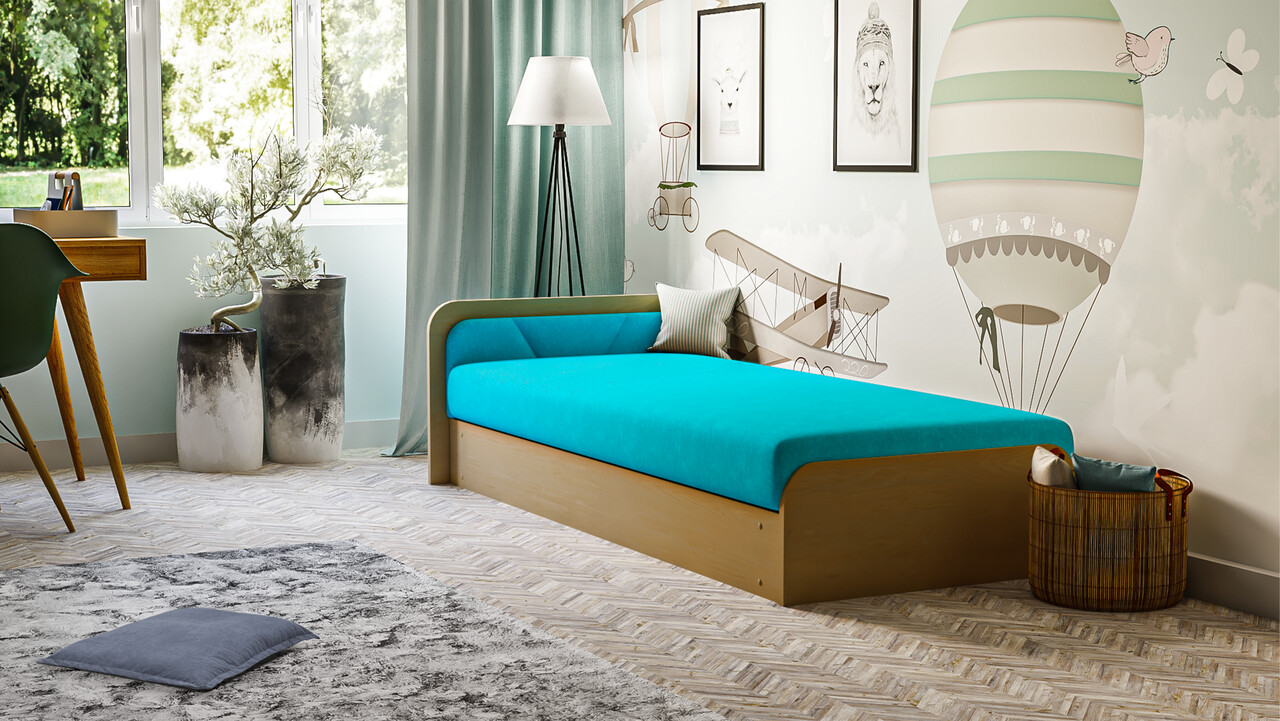 Pat pentru camera copilului, deschidere stanga, 80x190 cm, ELTAP, PS-07, Parys, lemn/poliester, natur/albastru deschis