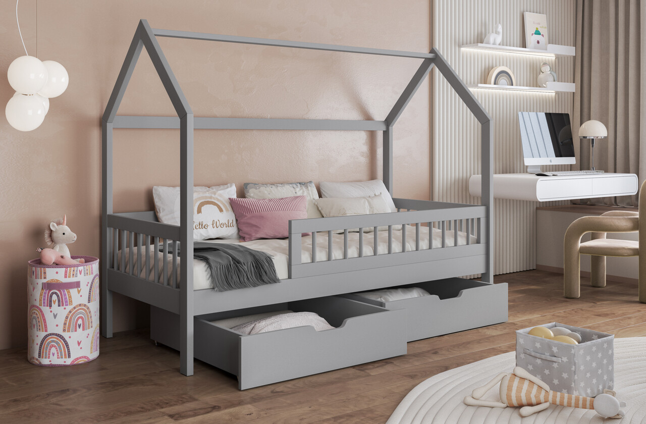 Pat pentru camera copilului Gaja, Meblobed, 90x200 cm, cu doua sertare, lemn de pin, gri
