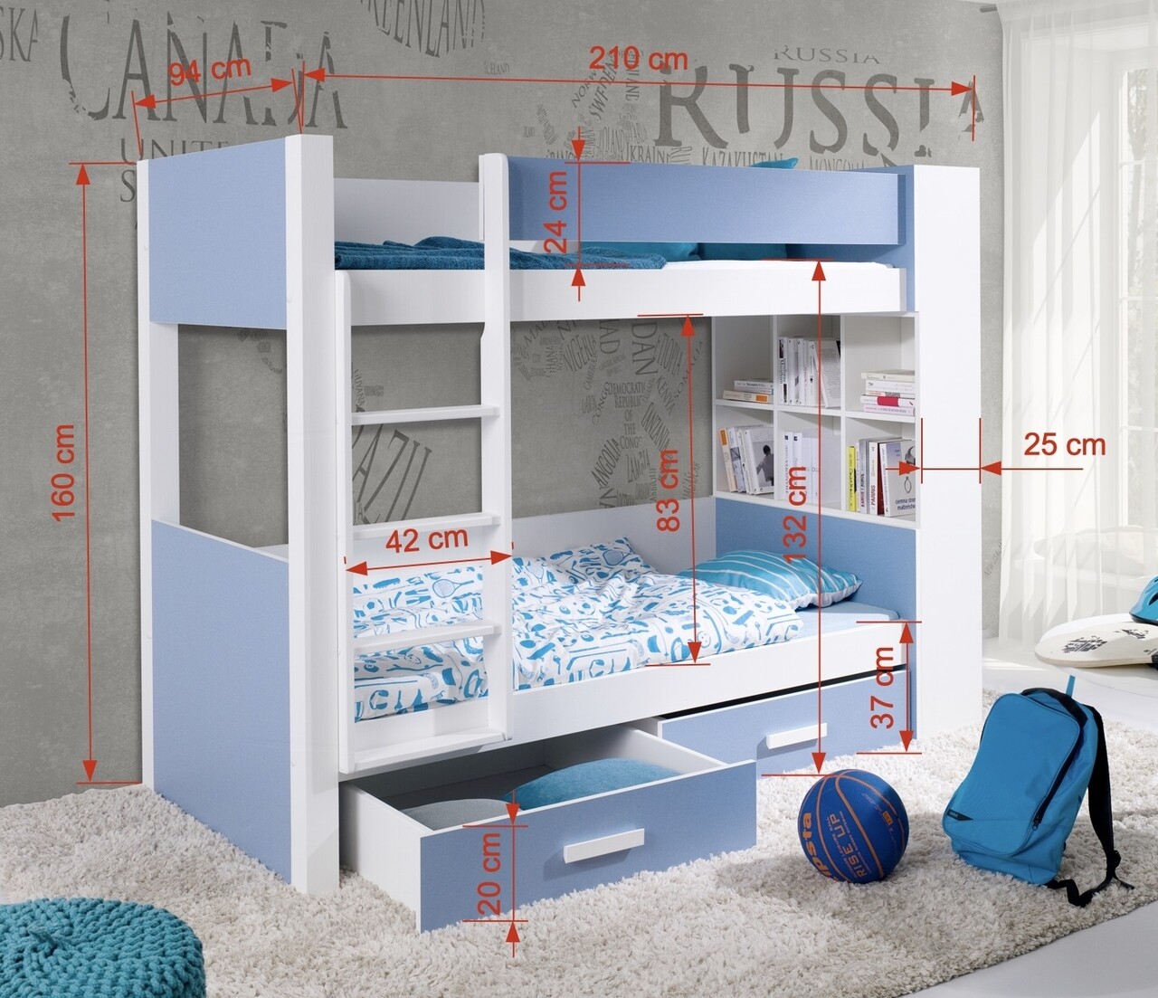 Pat supraetajat pentru camera copilului Gaspar, Meblobed, cu 2 sertare, 80x180 cm, lemn de pin, alb/albastru