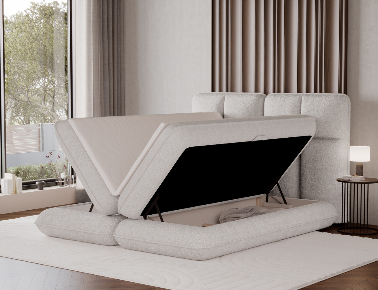 Pat tapitat cu lada depozitare, 140x200 cm, ELTAP, Tonila, lemn/poliester, alb