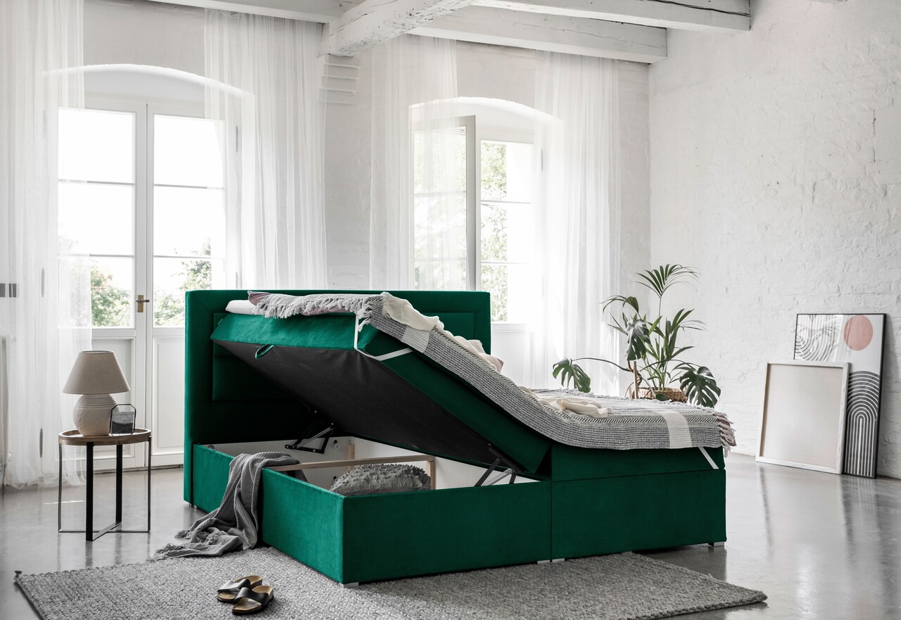 Pat tapitat cu lada depozitare, 180x200 cm, ELTAP, VIV-12-1.8, Vivre, lemn/poliester, verde inchis