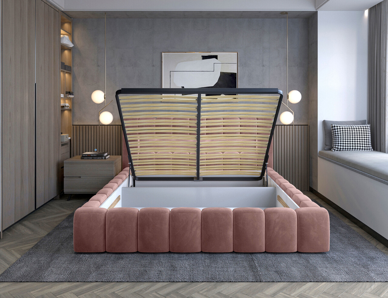 Pat tapitat cu somiera rabatabila si lada depozitare, 140x200 cm, ELTAP, Lamica, metal/poliester, roz