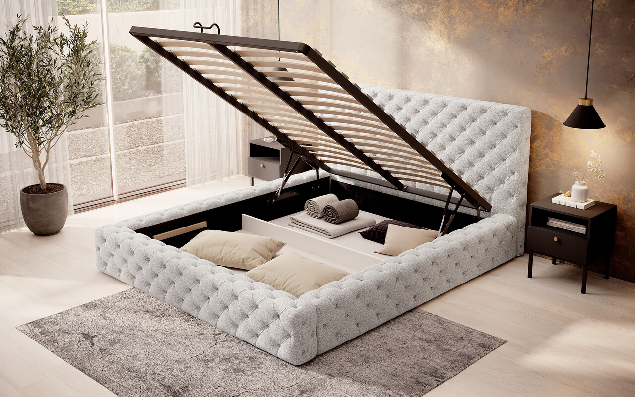 Un avantaj suplimentar este lada de depozitare spatioasa, ideala pentru organizarea lenjeriei de pat si a altor obiecte. In plus, somiera este formata din 36 de lamele rezistente, asigurand un suport optim pentru saltea.