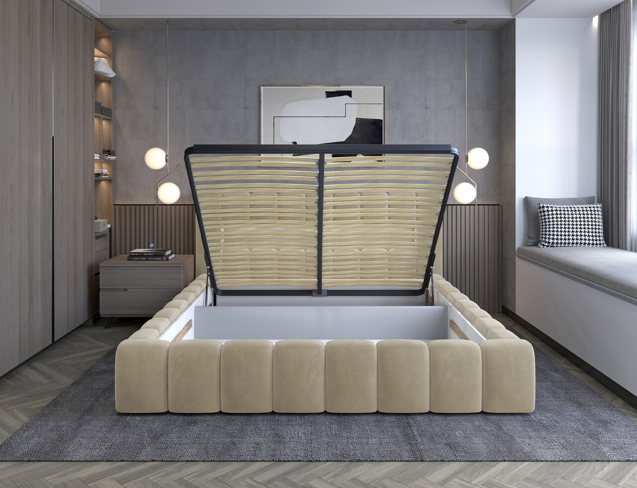 Pat tapitat cu somiera rabatabila si lada depozitare, 140x200 cm, ELTAP, Lamica, metal/poliester, bej
