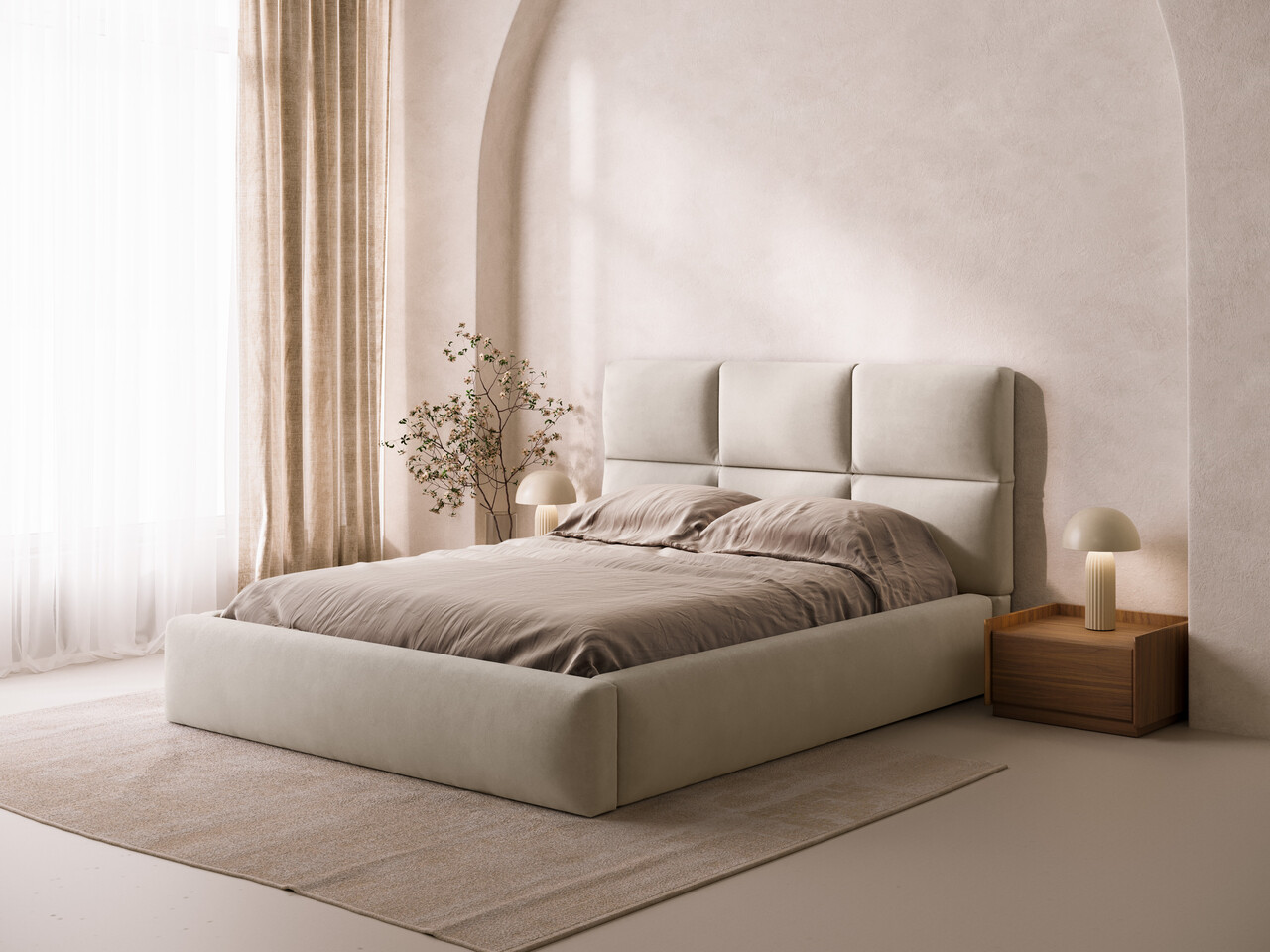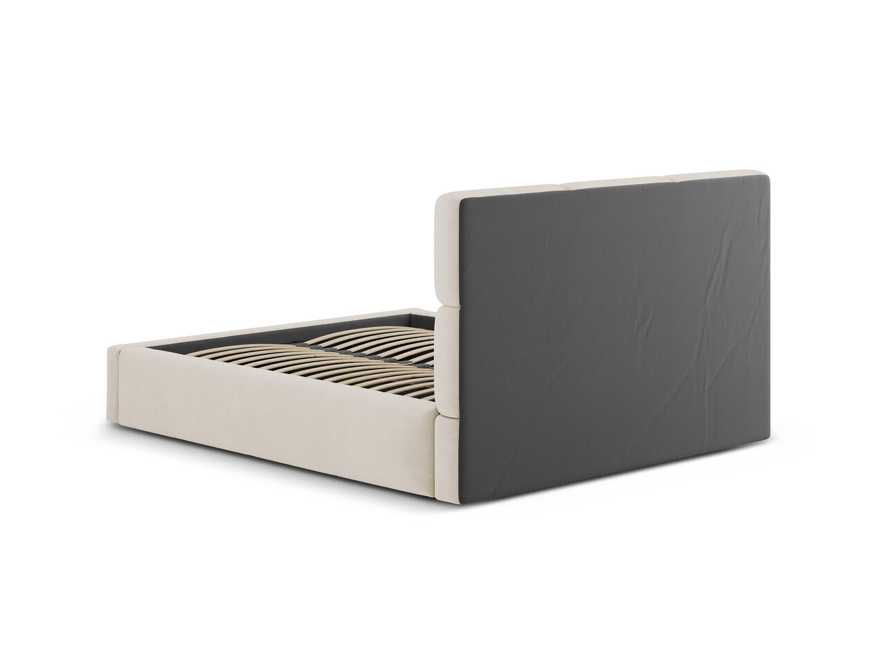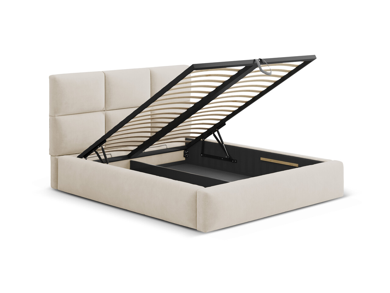 Pat tapitat cu somiera rabatabila si lada depozitare, 140x200 cm, Windsor & Co, Libera, catifea, bej inchis