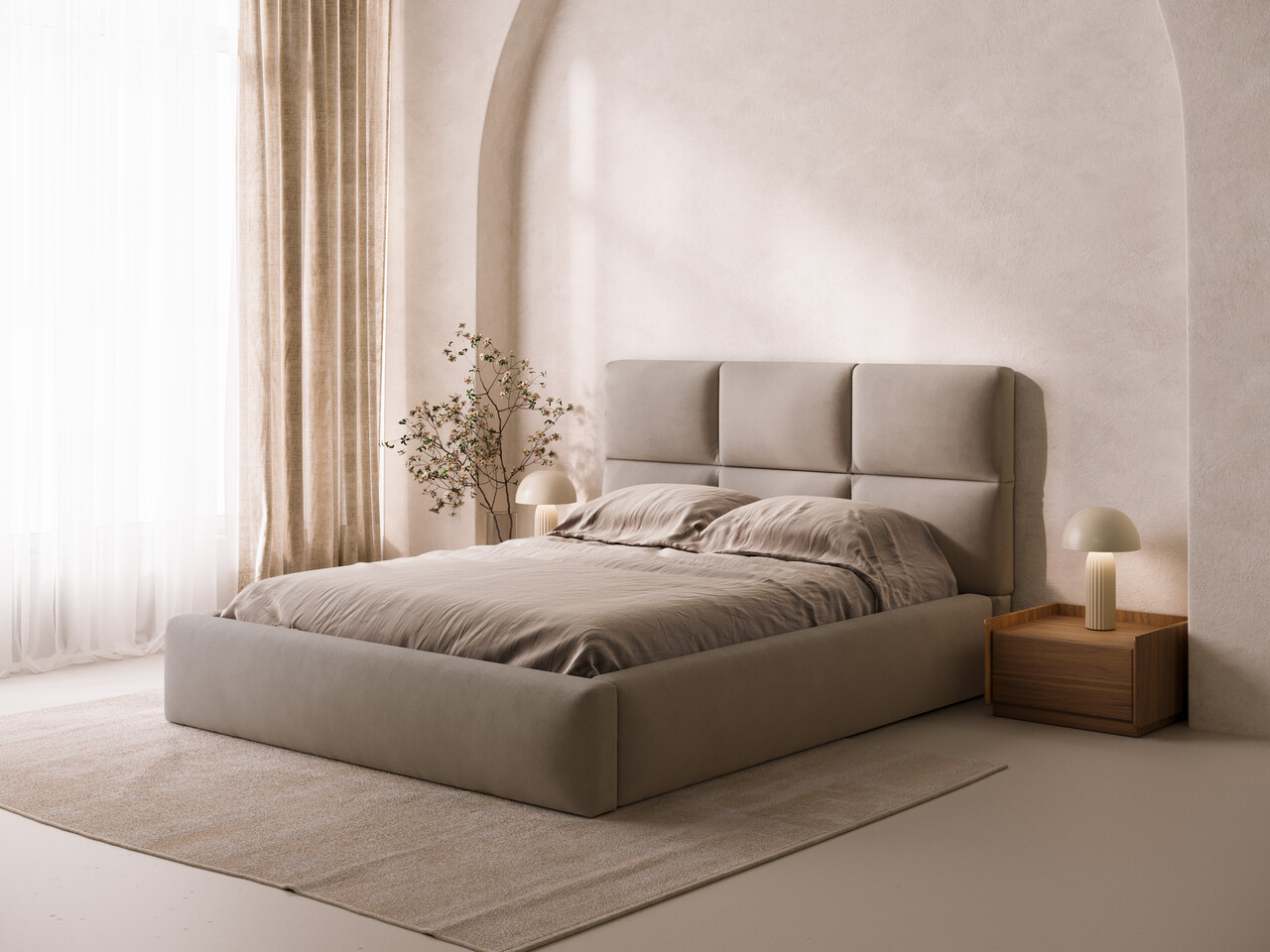 Pat tapitat cu somiera rabatabila si lada depozitare, 140x200 cm, Windsor & Co, Libera, catifea, cappuccino