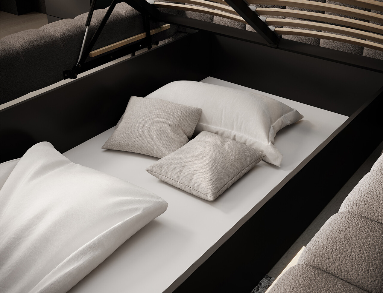 Pat tapitat cu somiera rabatabila si lada depozitare, 140x200 cm, ELTAP, Magentta, metal/poliester, maro inchis
