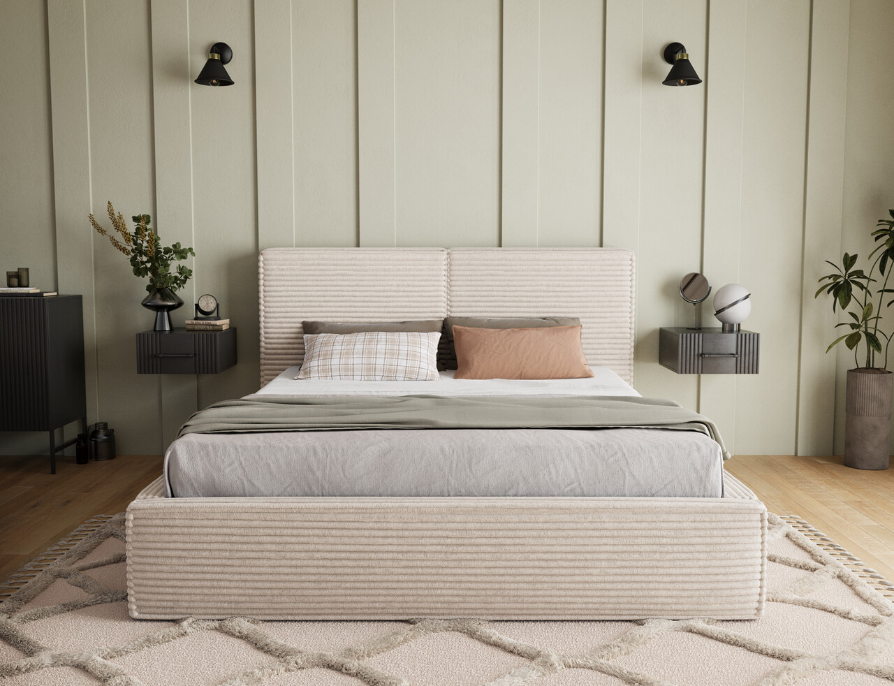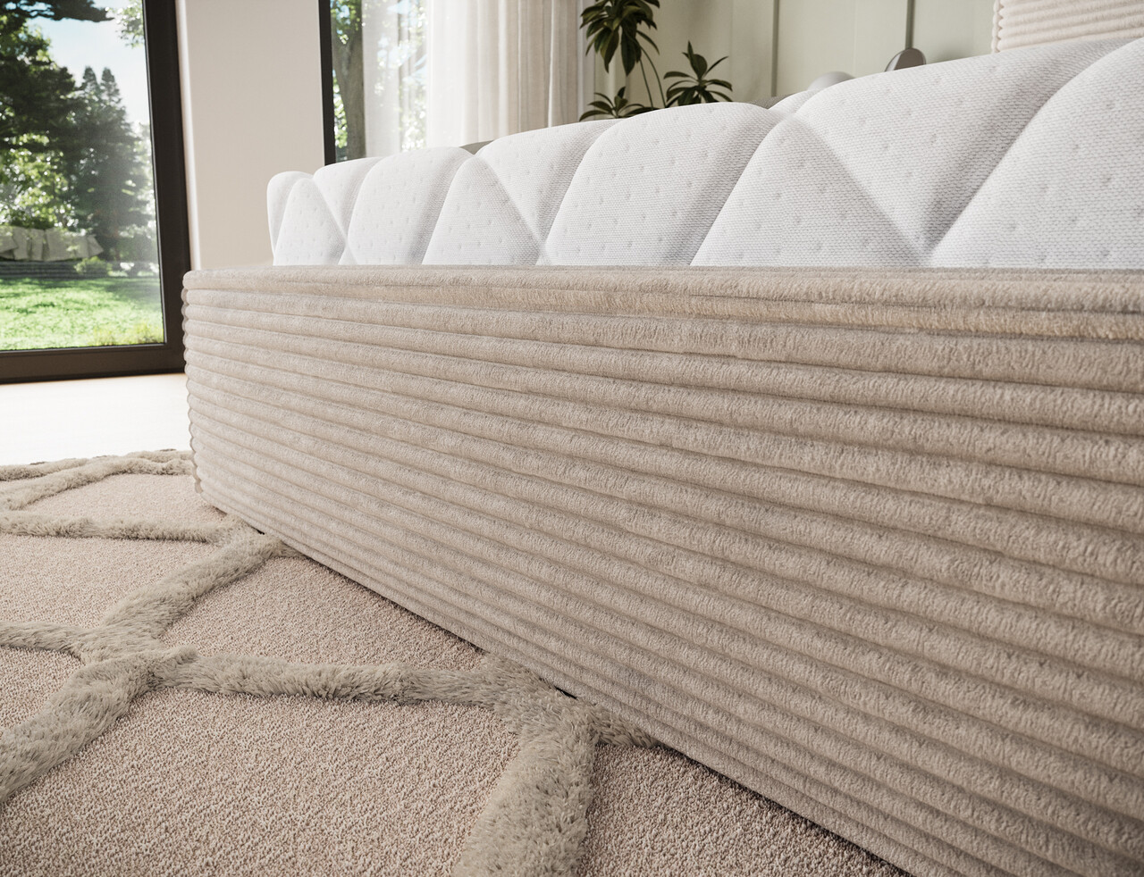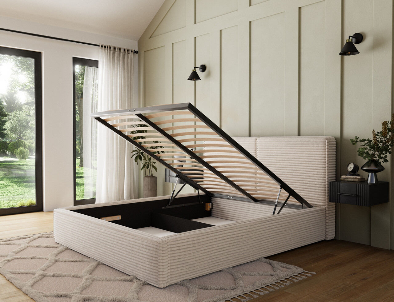 Pat tapitat cu somiera rabatabila si lada depozitare, 140x200 cm, ELTAP, Pesillo, metal/poliester, bej deschis