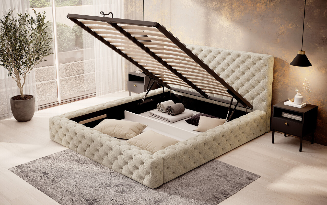 Pat tapitat cu somiera rabatabila si lada depozitare, 160x200 cm, ELTAP, Princce, metal/poliester, bej deschis