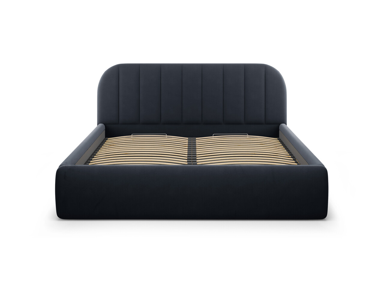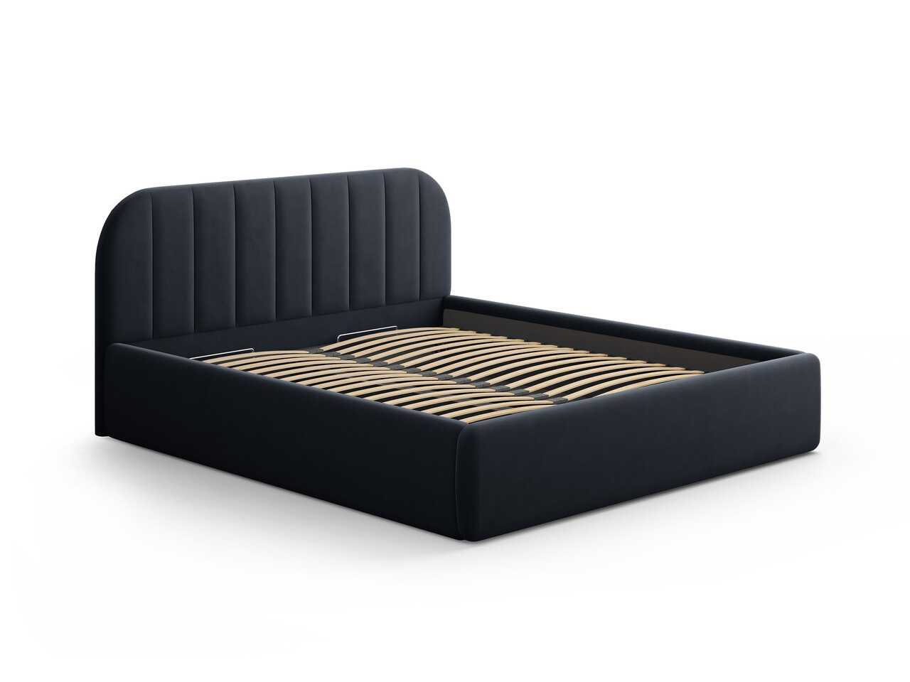 Pat tapitat cu somiera rabatabila si lada depozitare, 160x200 cm, Windsor & Co, Juno, catifea, albastru inchis