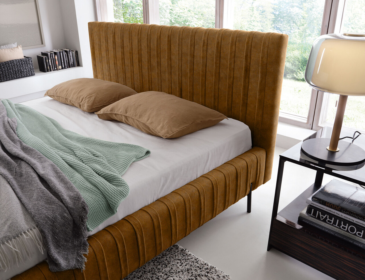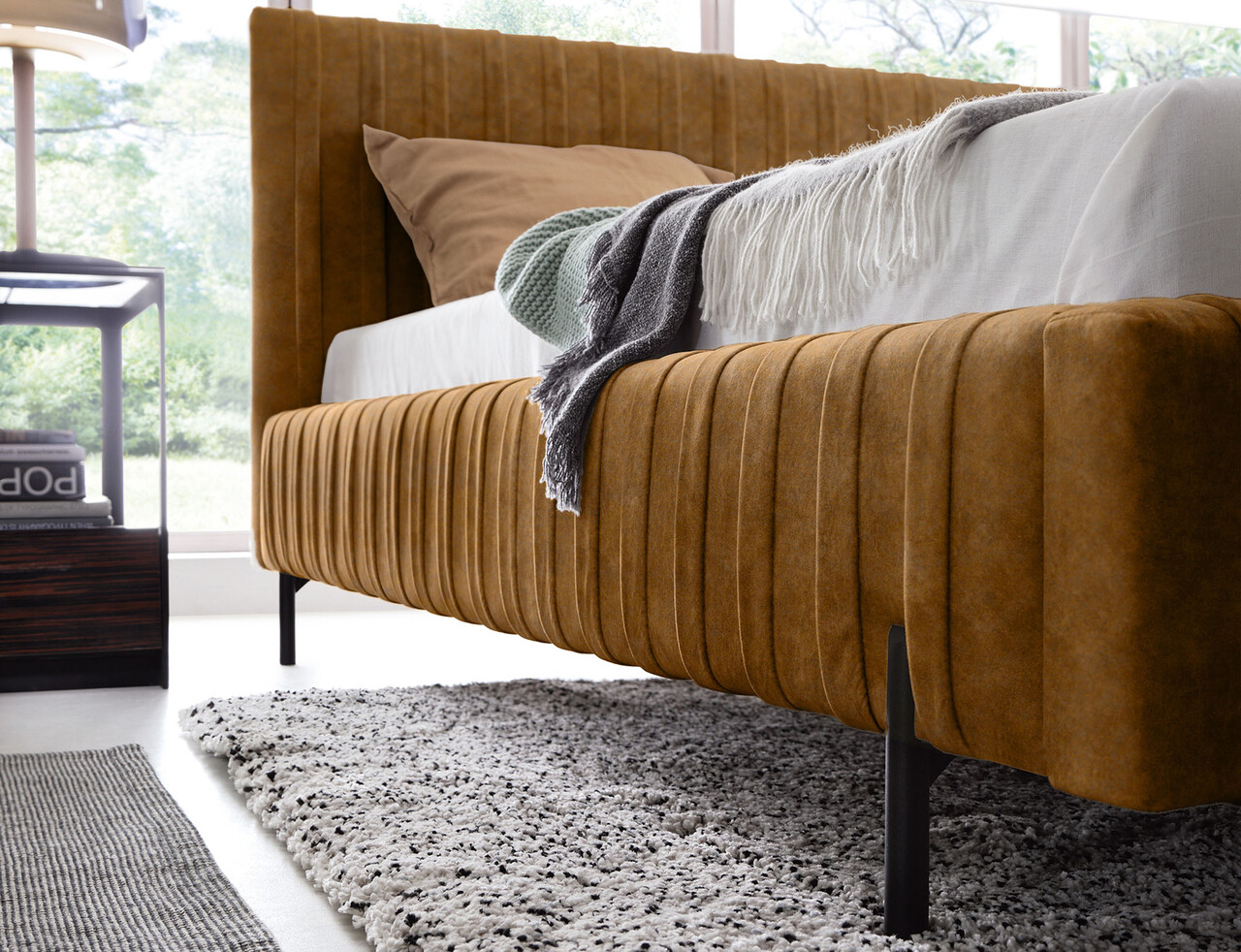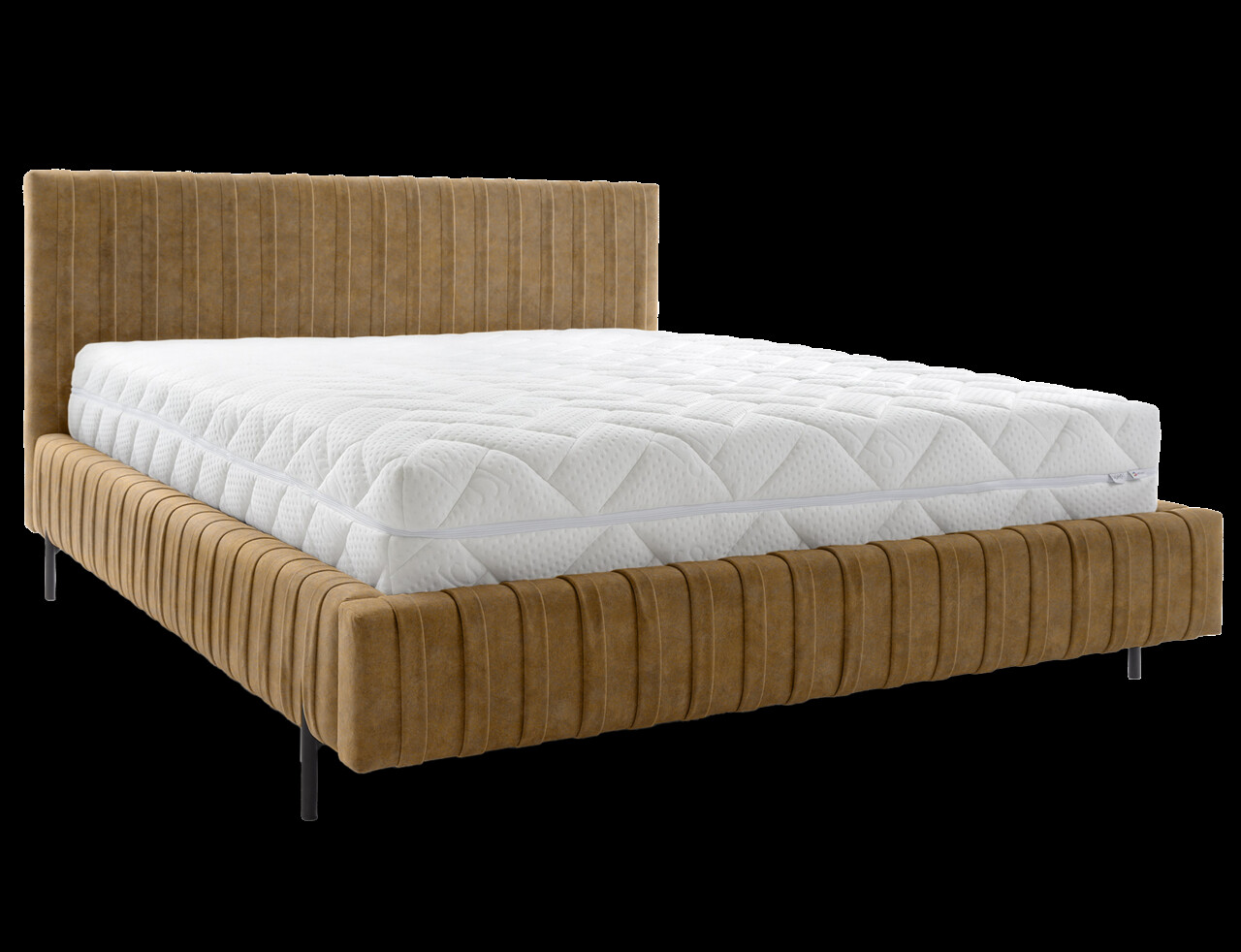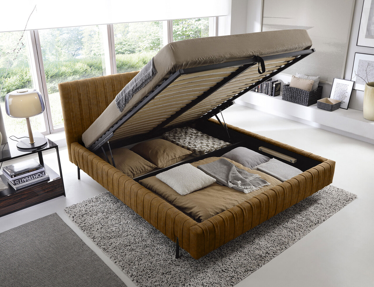 Pat tapitat cu somiera rabatabila si lada depozitare, 180x200 cm, ELTAP, Plissa, metal/poliester, camel