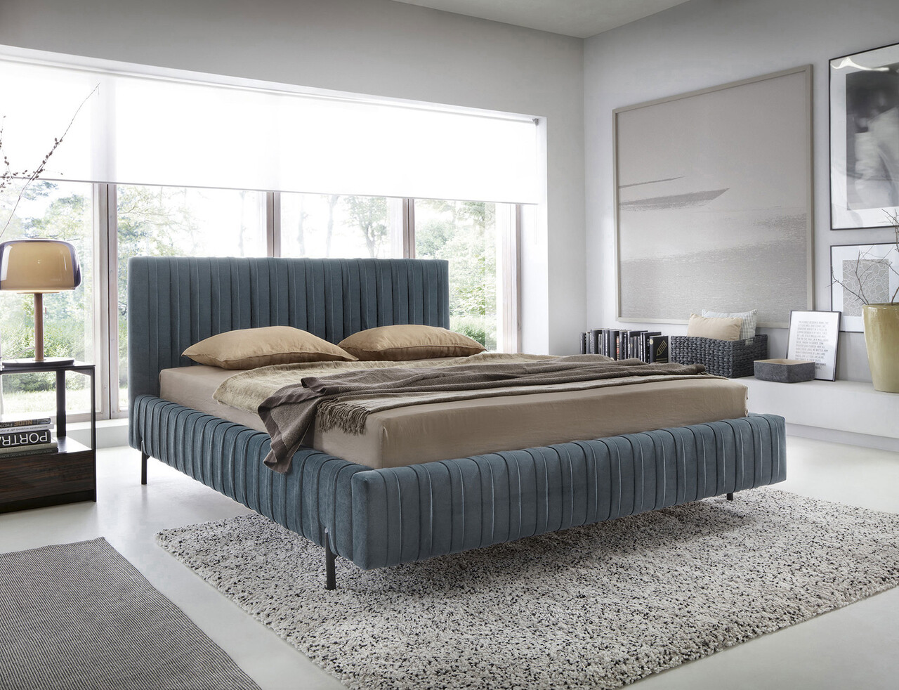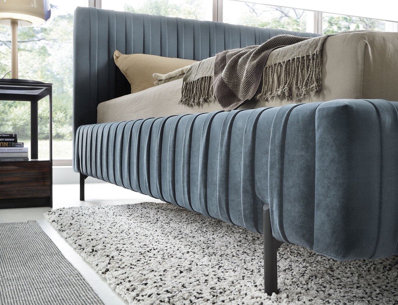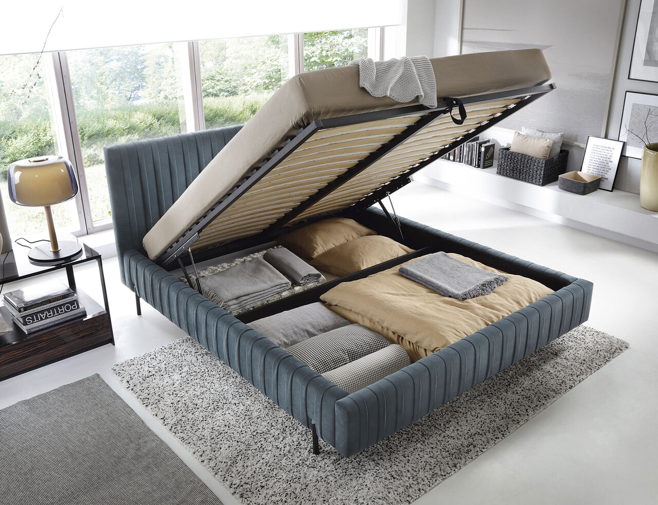 Pat tapitat cu somiera rabatabila si lada depozitare, 180x200 cm, ELTAP, Plissa, metal/poliester, albastru deschis