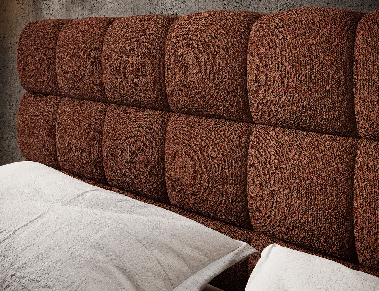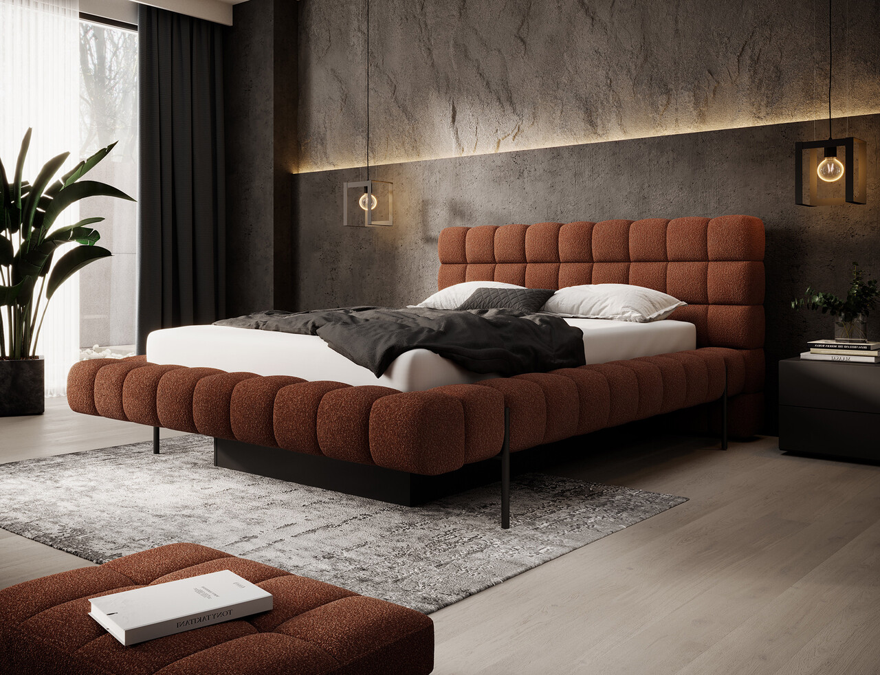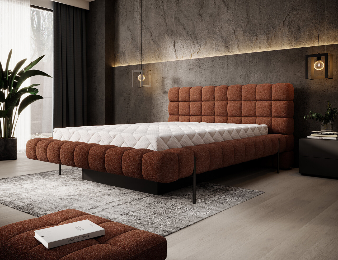 Pat tapitat cu somiera rabatabila si lada depozitare, 180x200 cm, ELTAP, Magentta, metal/poliester, caramiziu
