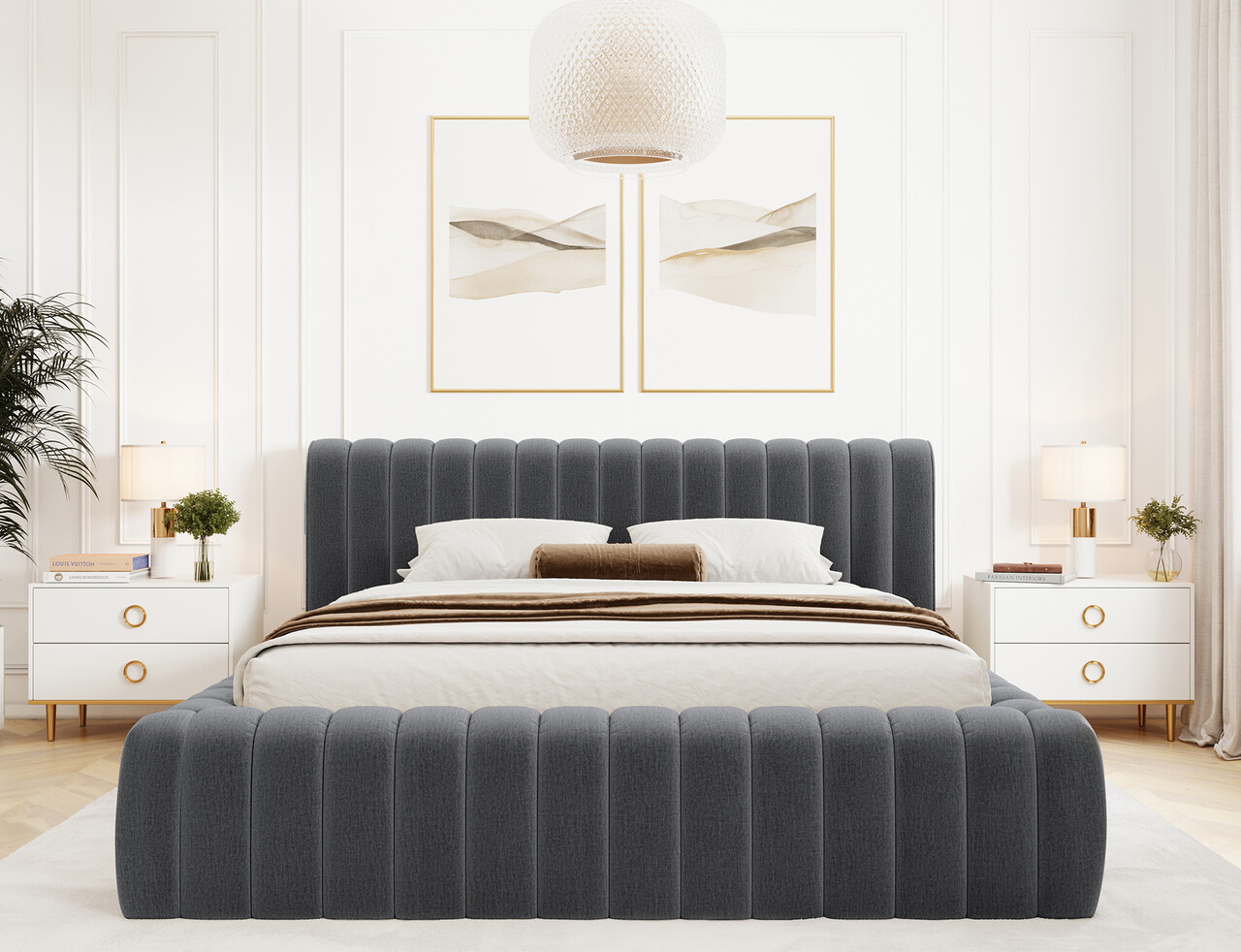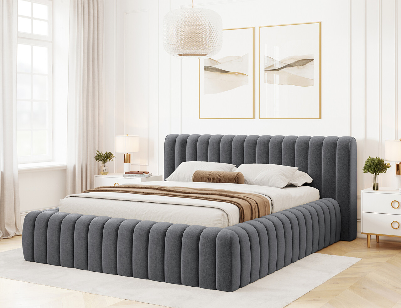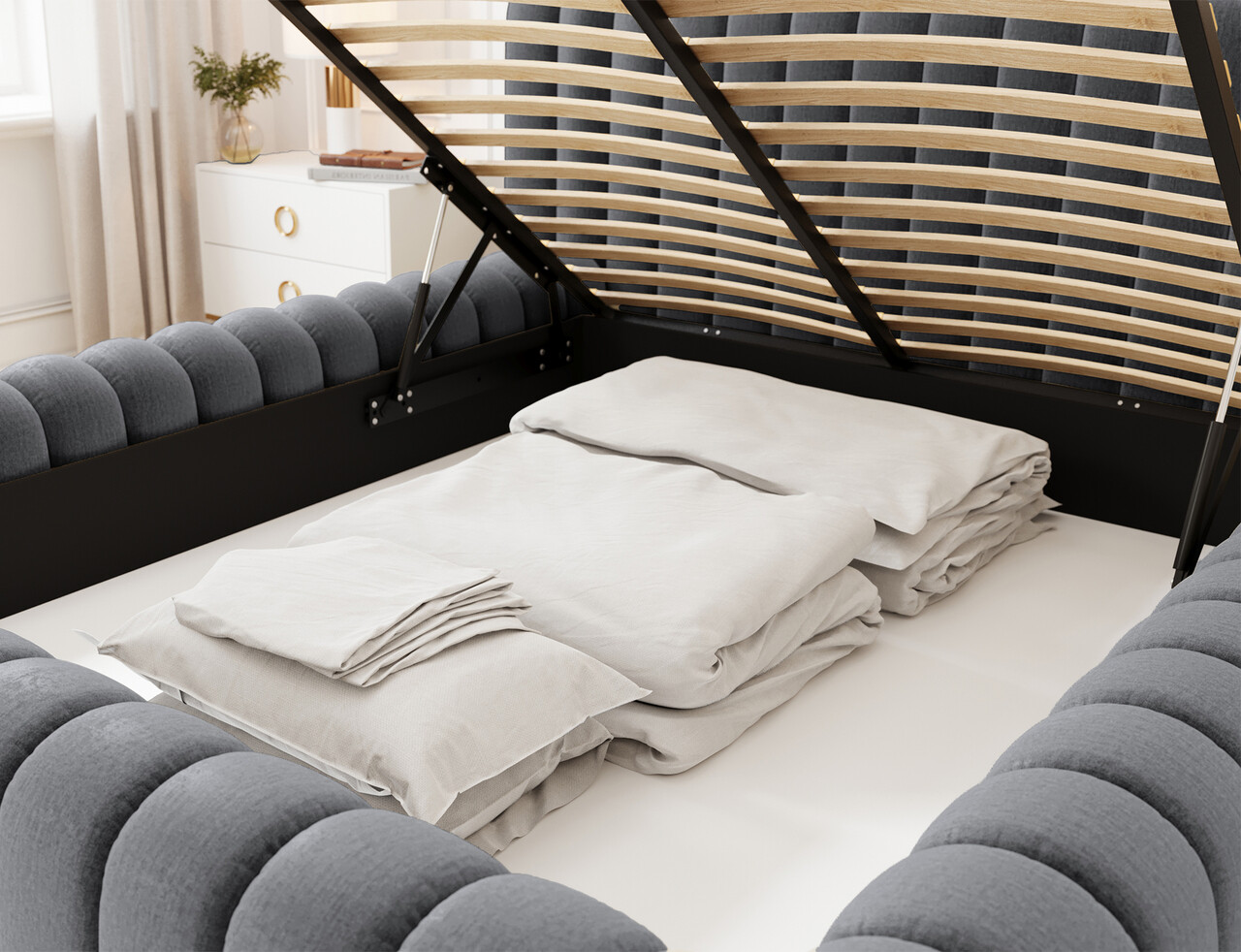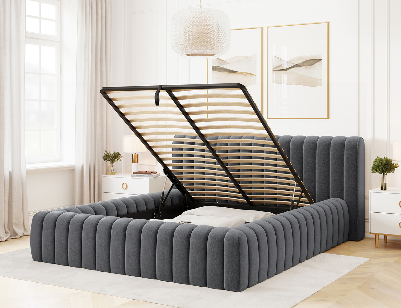Pat tapitat cu somiera rabatabila si lada depozitare, 180x200 cm, ELTAP, 97MO-1.8, Carilla, metal/poliester, gri inchis