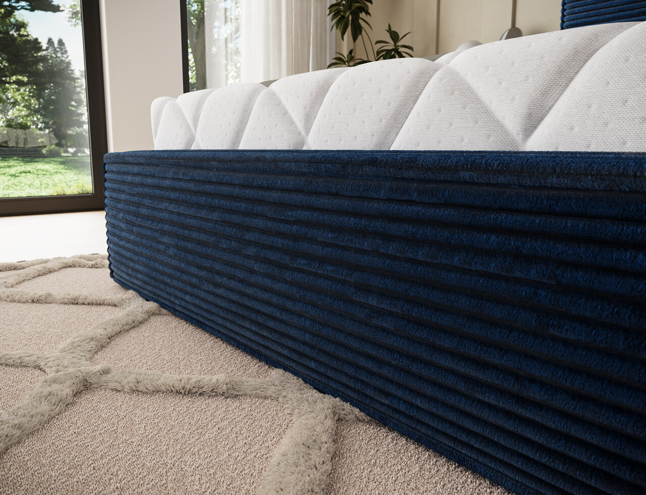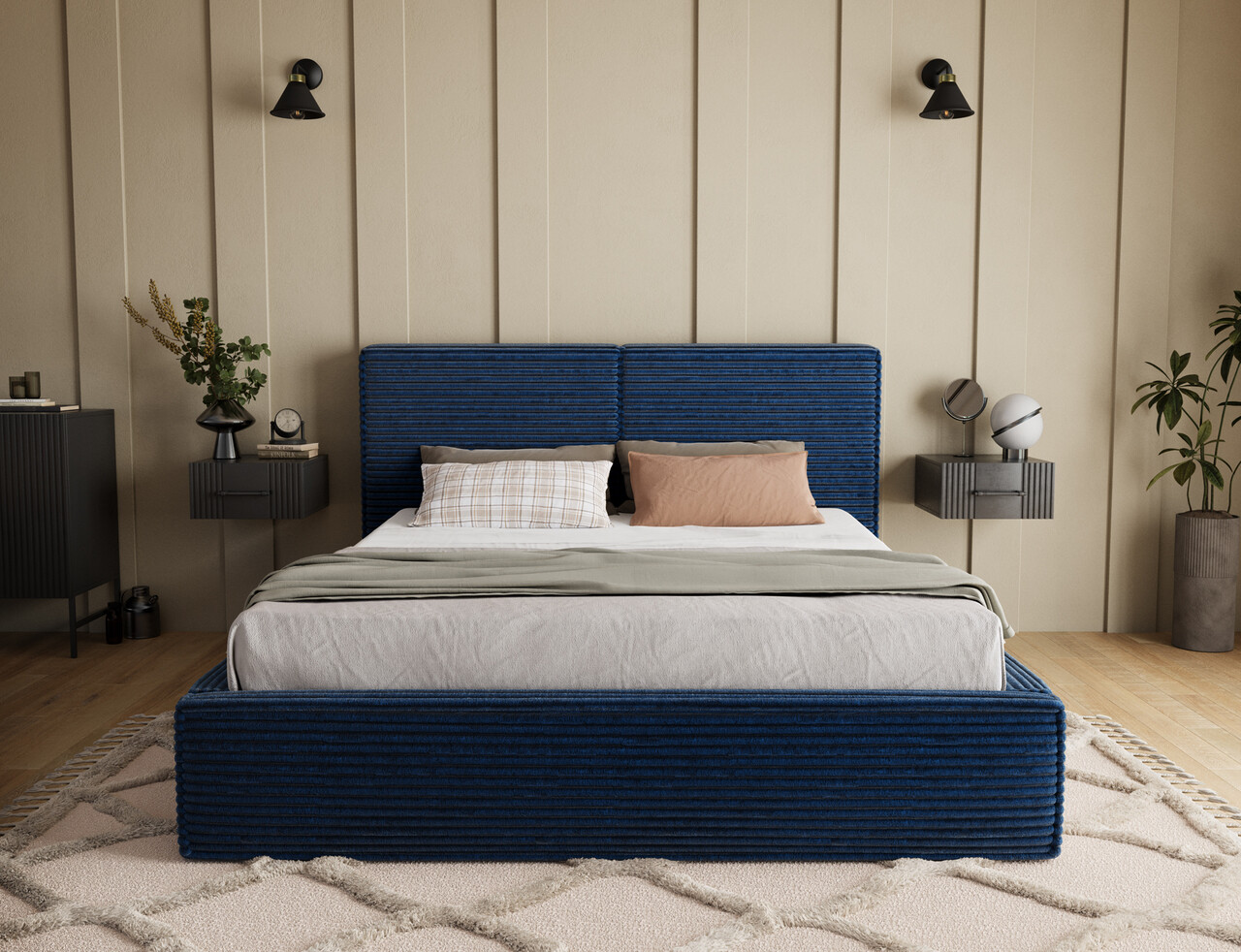 Pat tapitat cu somiera rabatabila si lada depozitare, 180x200 cm, ELTAP, Pesillo, metal/poliester, albastru inchis