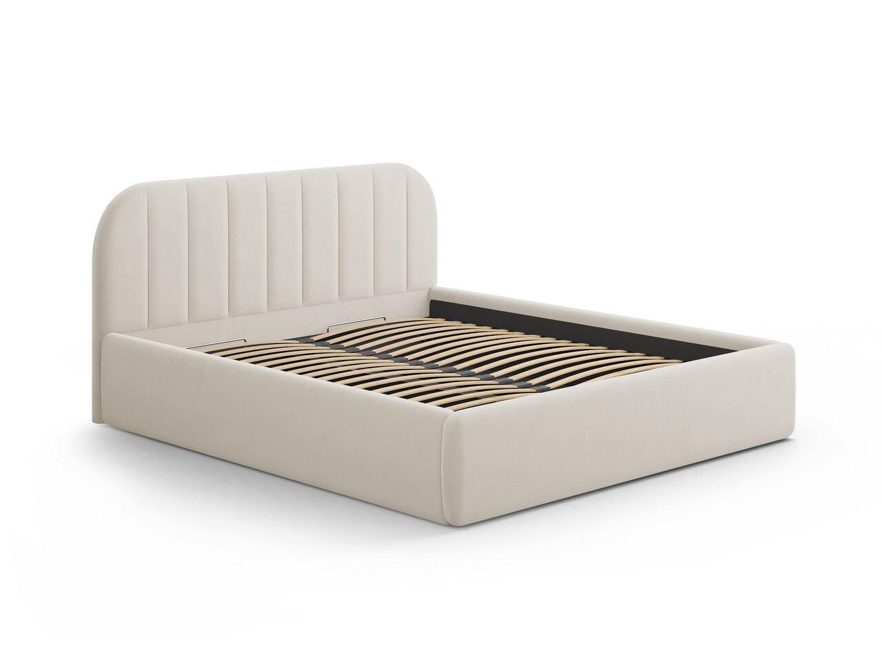 Pat tapitat cu somiera rabatabila si lada depozitare, 200x200 cm, Windsor & Co, Juno, catifea, bej inchis