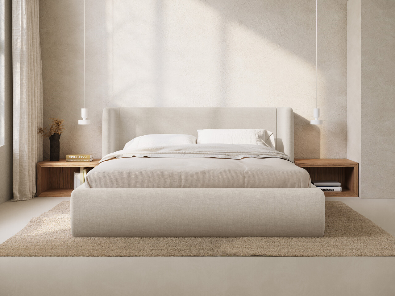 Pat tapitat cu somiera rabatabila si lada depozitare, 200x200 cm, Windsor & Co, Jason, tesatura structurata, bej deschis
