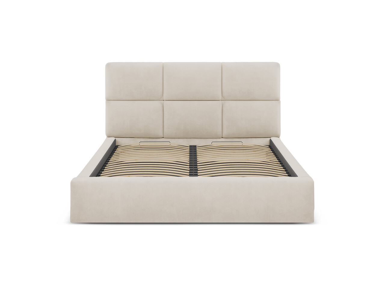 Pat tapitat cu somiera rabatabila si lada depozitare, 200x200 cm, Windsor & Co, Libera, catifea, bej inchis